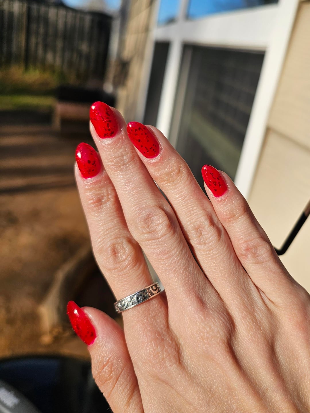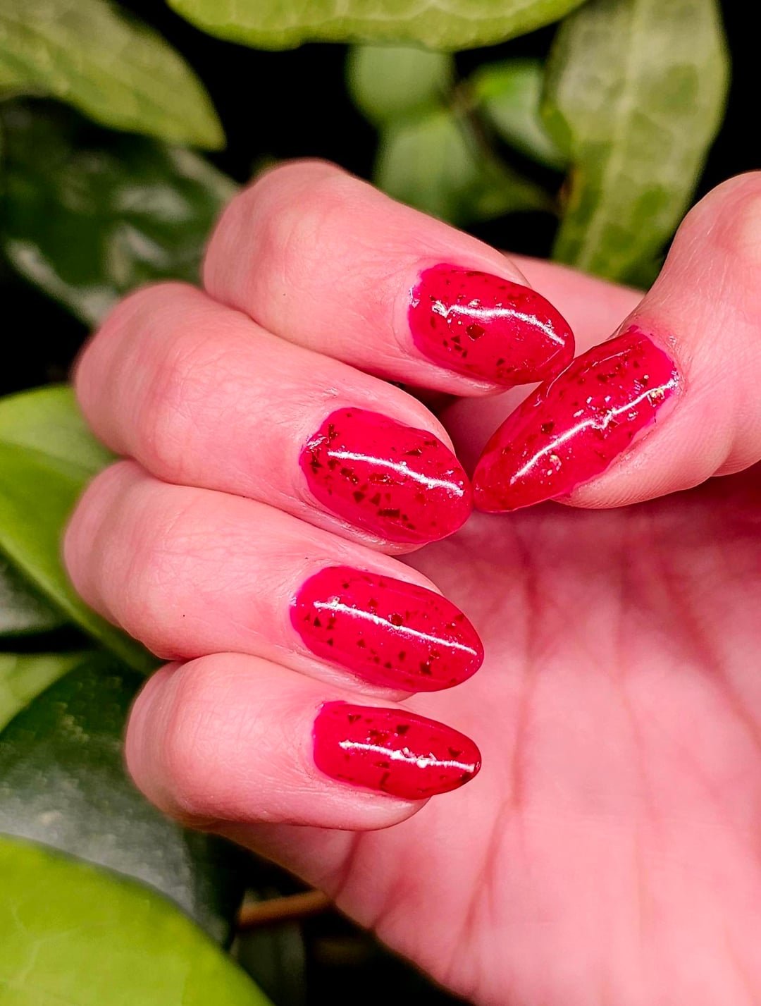 Over a clear builder gel base, I used 2 coats of color + 2 coats Essie gel setter top coat bc some flakies needed more smoothing. This is a red jelly with shiny red flakes. Does not give off pink or purple vibes, definitely red! by petsplantscamps