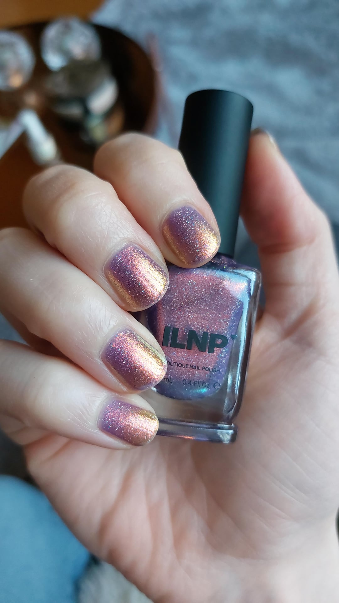 This is the first full-mani I've done with anything from that haul. I was convinced it would be my least favourite because I'm not a fan of purple, but I… I'm obsessed? The shimmer makes it seems sunrise golden purple and the holo is just perfect. Decided it'd be fun to wear for my niece's first birthday party today!