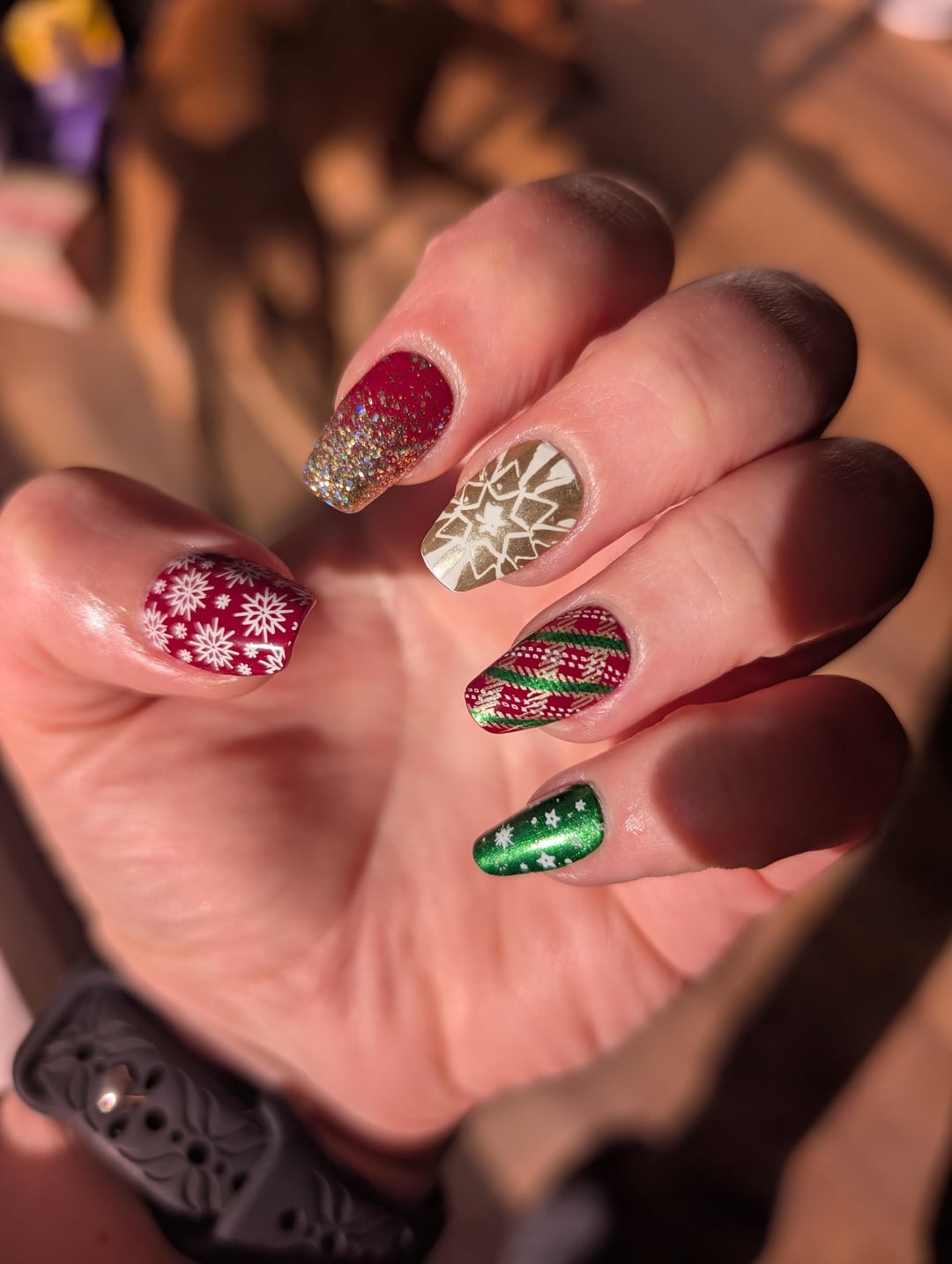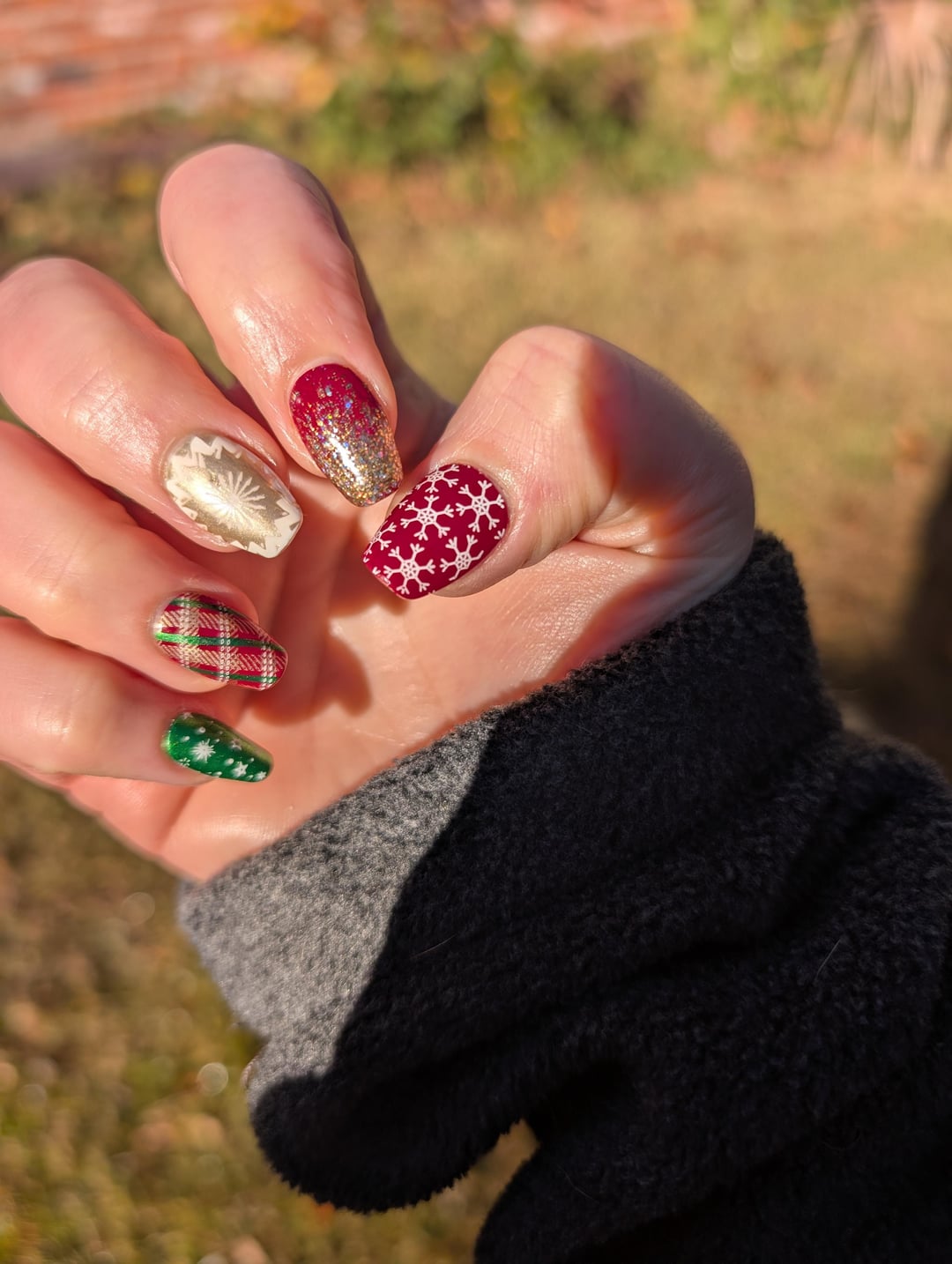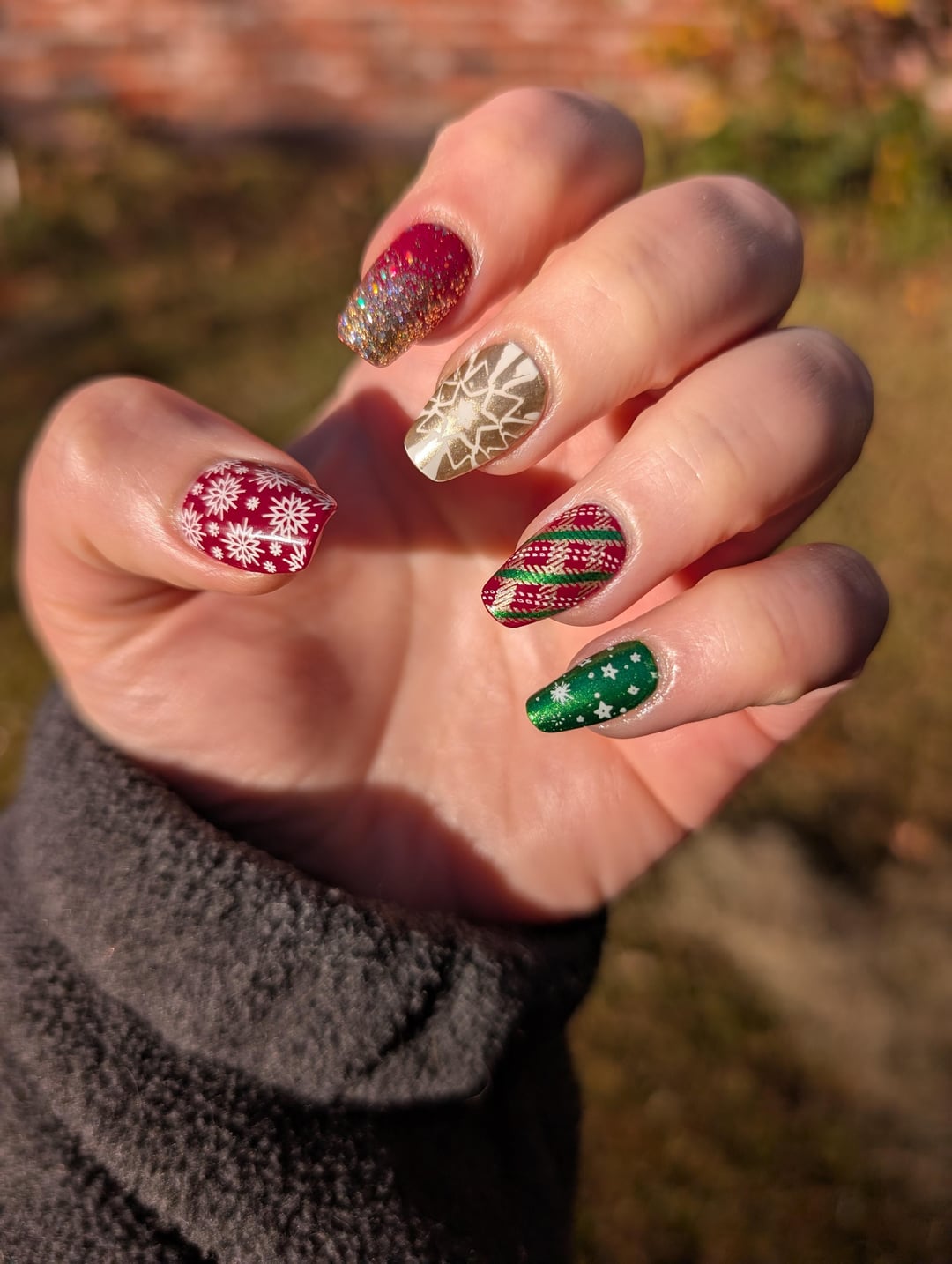 Madelone coffin blanks, Orly Bonder, Essie Forever Yummy, Messy Mansion Soft Gold, Born Pretty green, Uber Chic Essential White, Salon Perfect All That Glitter is Gold, Maniology Smudge Free, KB Shimmer Smooth Moves on the glitter bomb, Essie Gel Couture Top Coat. Uber Chic Stamping plates