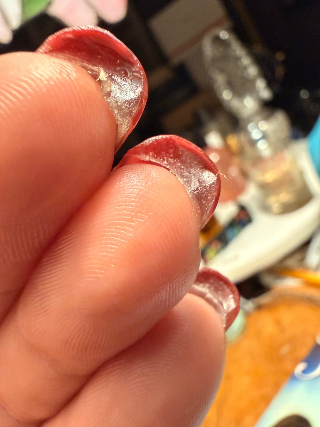 I wasn't sure what was normal and I knew they felt weird when I was leaving, but I didn't really look at them until I got home. There's a ton of gel or glue underneath the nails. It's really irritating my skin. And does it not look like the nails are kind of lifting up? The polish also looks really uneven and bumpy to me. I did email them but plan to go in the morning as well.