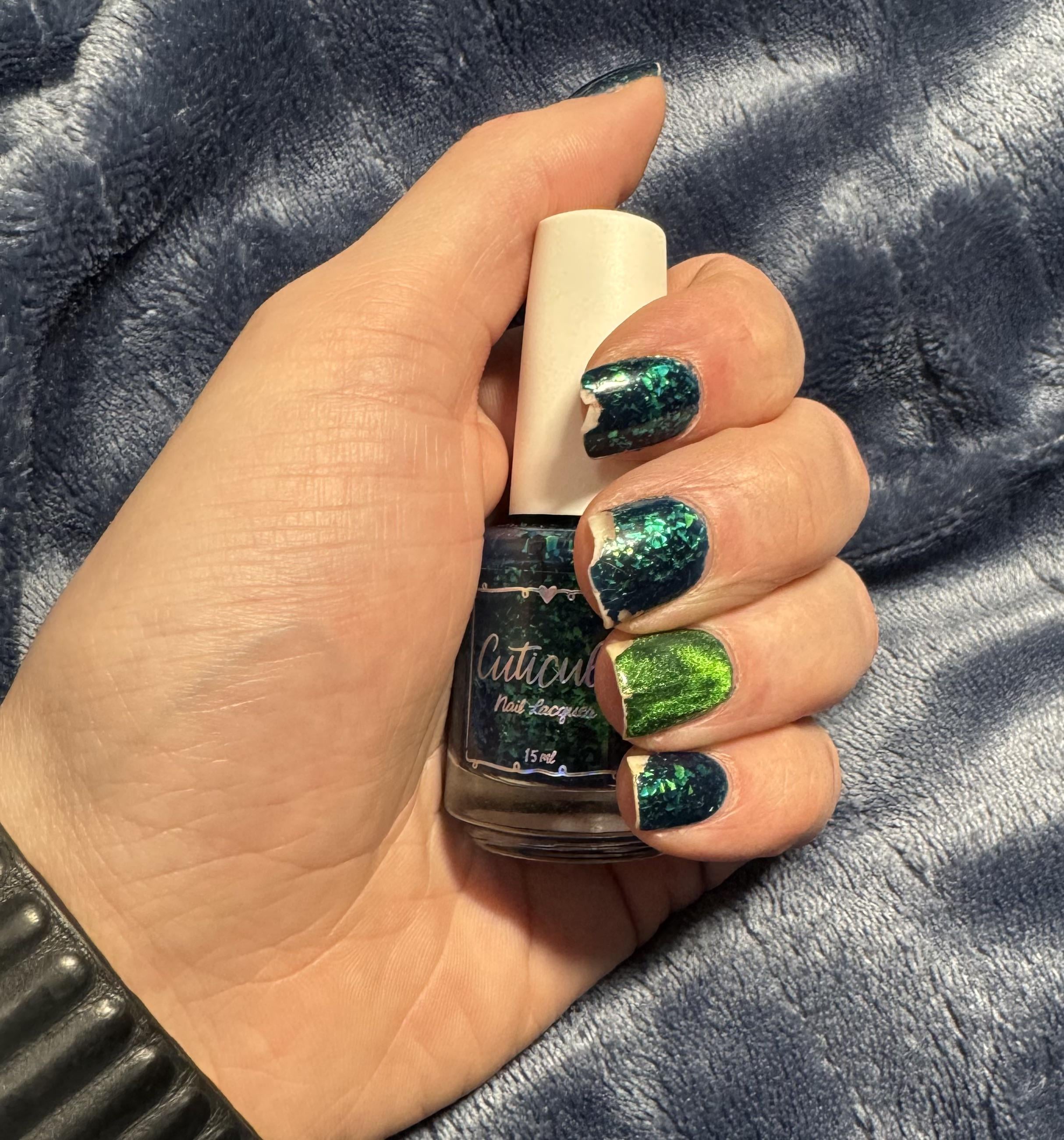 rezerection on December 22, 2025 12:13 am What a rough winter and it’s only half over ❄️ This is day 2 of this mani btw lol Nailtiques formula 2 1x Cuticula Kraken’s Wrath 3x Mooncat Mutiny 2x horseshoe + bar magnet on my ring finger Sally Hansen insta dri red bottle 1 x
