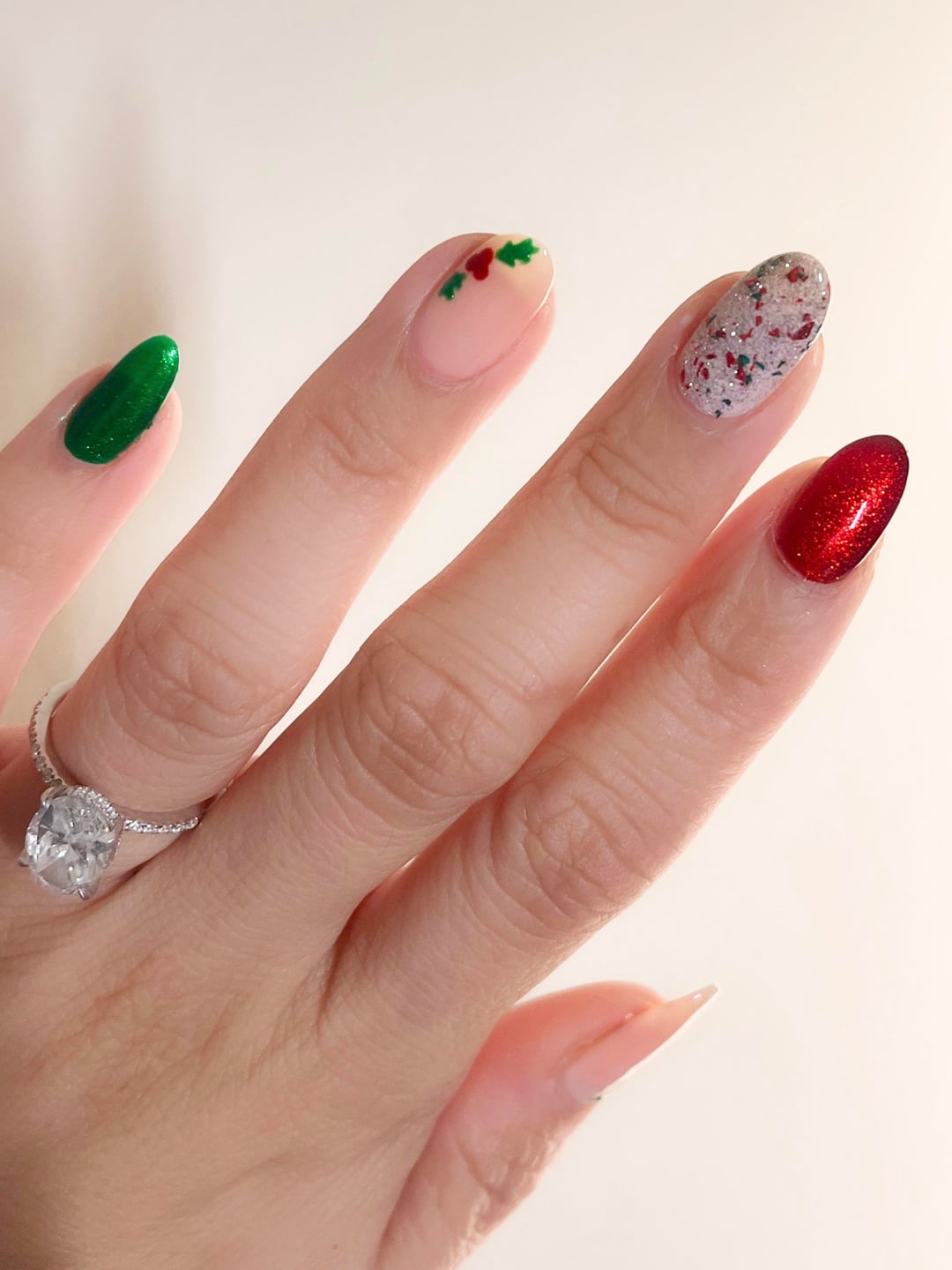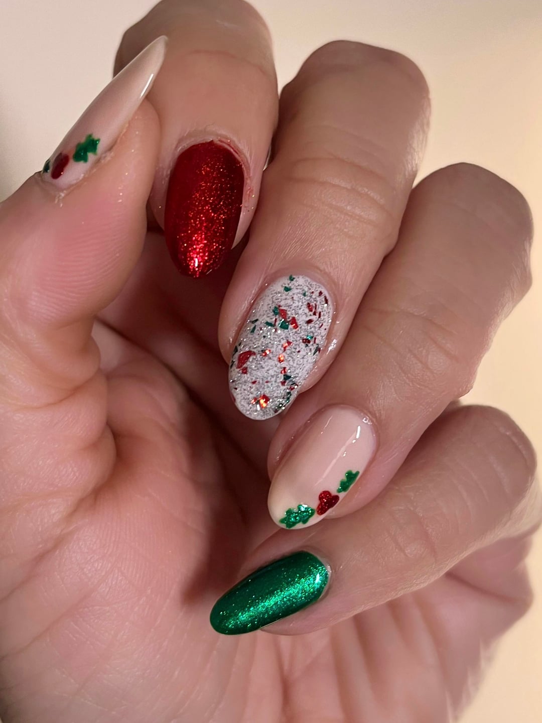 I started off wanting a simple minimalist mani, with just red nails and one accent nail with the simple nail art. But then I remembered I had this glorious Colored de Carol Xmas topper with reflective glitter and red and green metallic flakes so I figured I’d go super maximalist and do the topper on 2 nails and different full nail nail art on the other fingers. But nail art is hard and I have to go make dinner soon, so I settled for a combo of my minimalist and maximalist manicures.