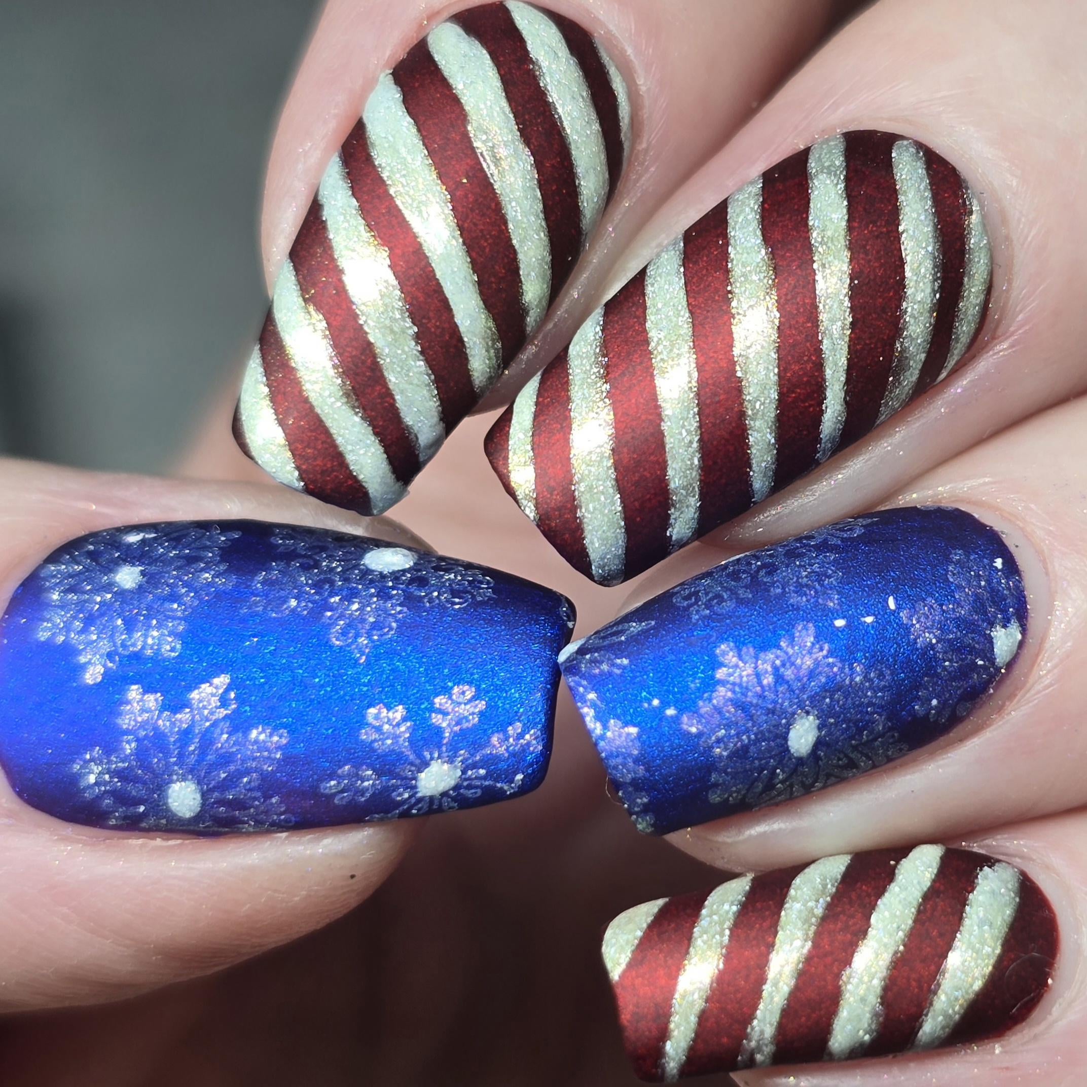 Colores de carol Slappy’s Tie and Polishes for Days What a Nightmare as the base for the nail art Butter London Matte top coat. Halo Taco Sugar Rush for the stripes (free hand stripping brush) and stamping. Stamping plateLuna 4 season winter 02