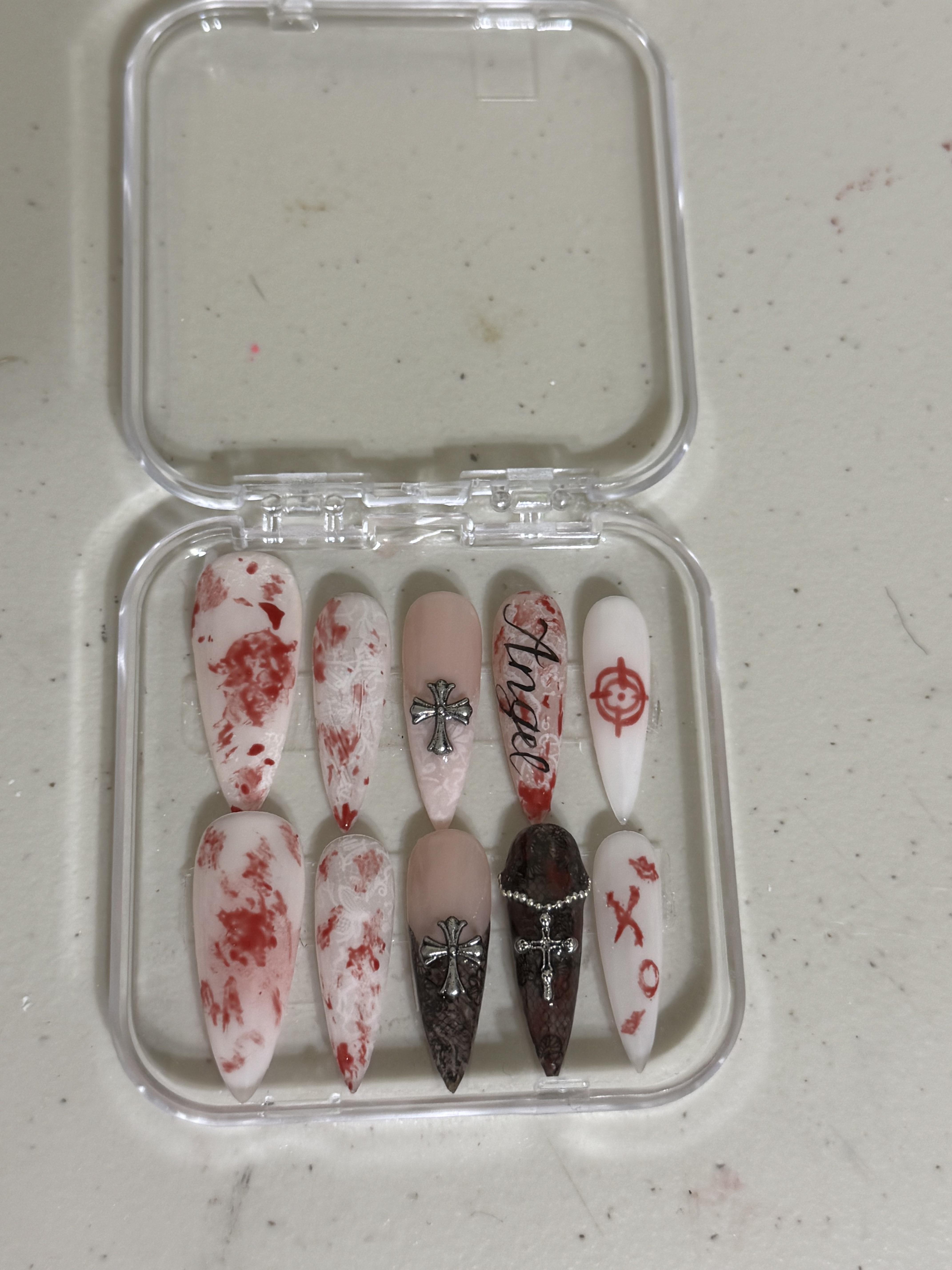 didnt really have inspo for this set buuut the color scheme reminded me of She Wants Revenge and the vibe just reminded me of an Ethel Cain song lol :3 also my first attempt with lace foils! gave me hella trouble though so tips are appreciated ðŸ˜