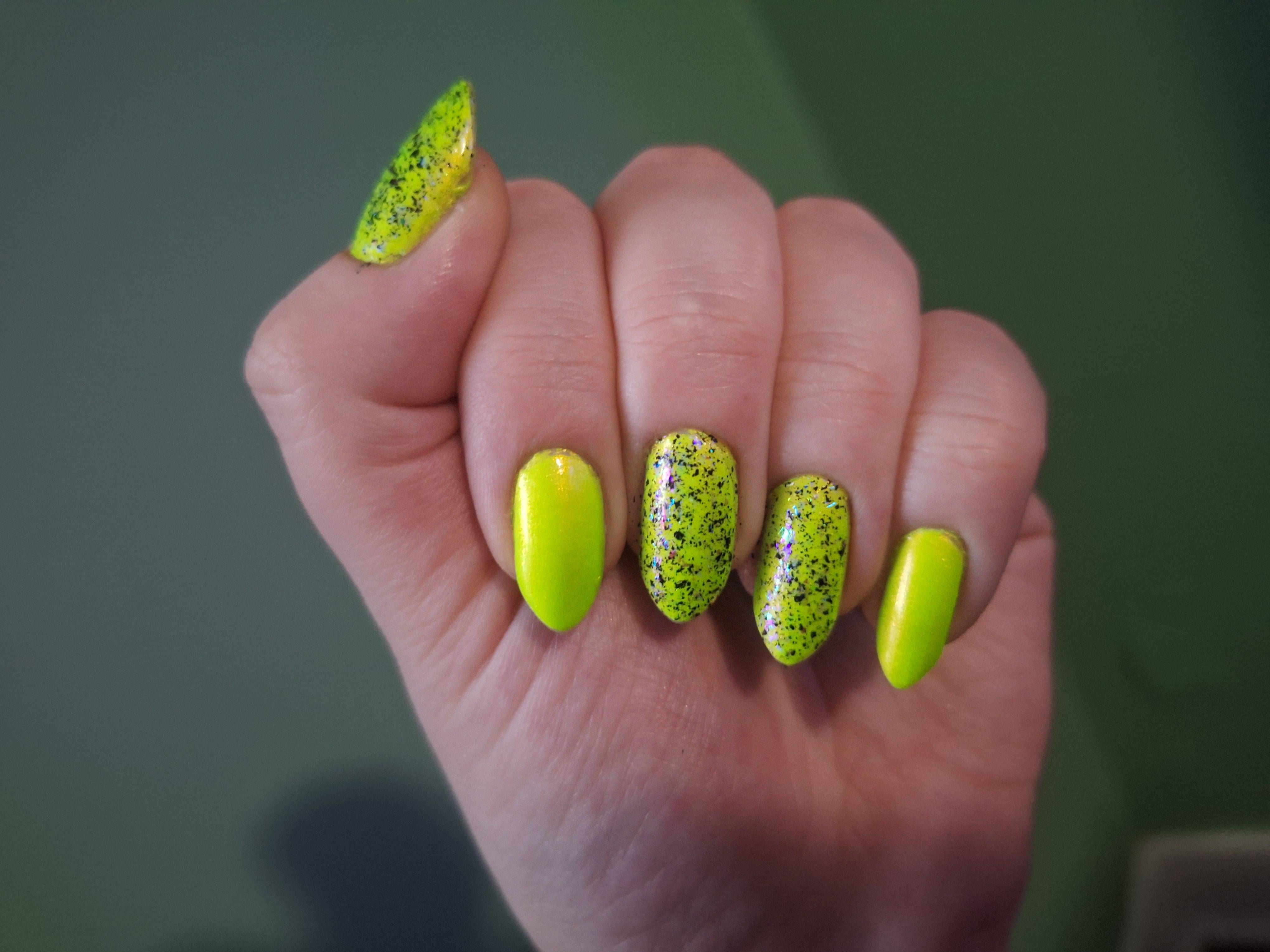 Essie strong start base coat 3 coats of Atomic Polish's Sour Apple Rings on every finger 1 coat of Alchemy Lacquers' Technicolor Cobweb on middle, ring, and thumb Essie good to go top coat by AbbertDabbert