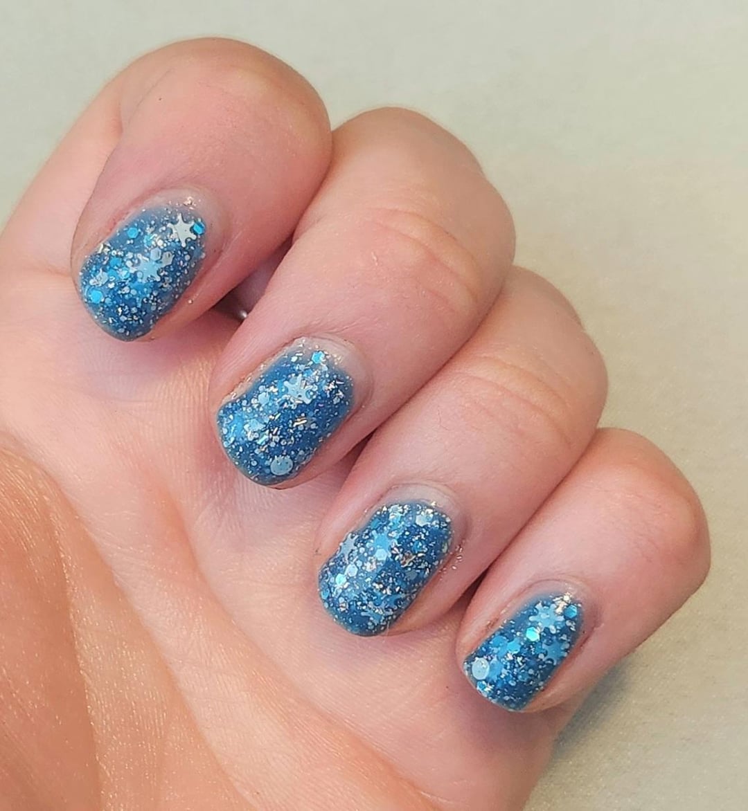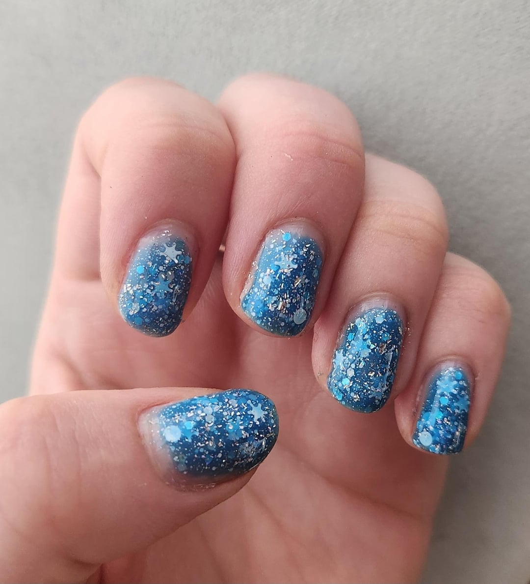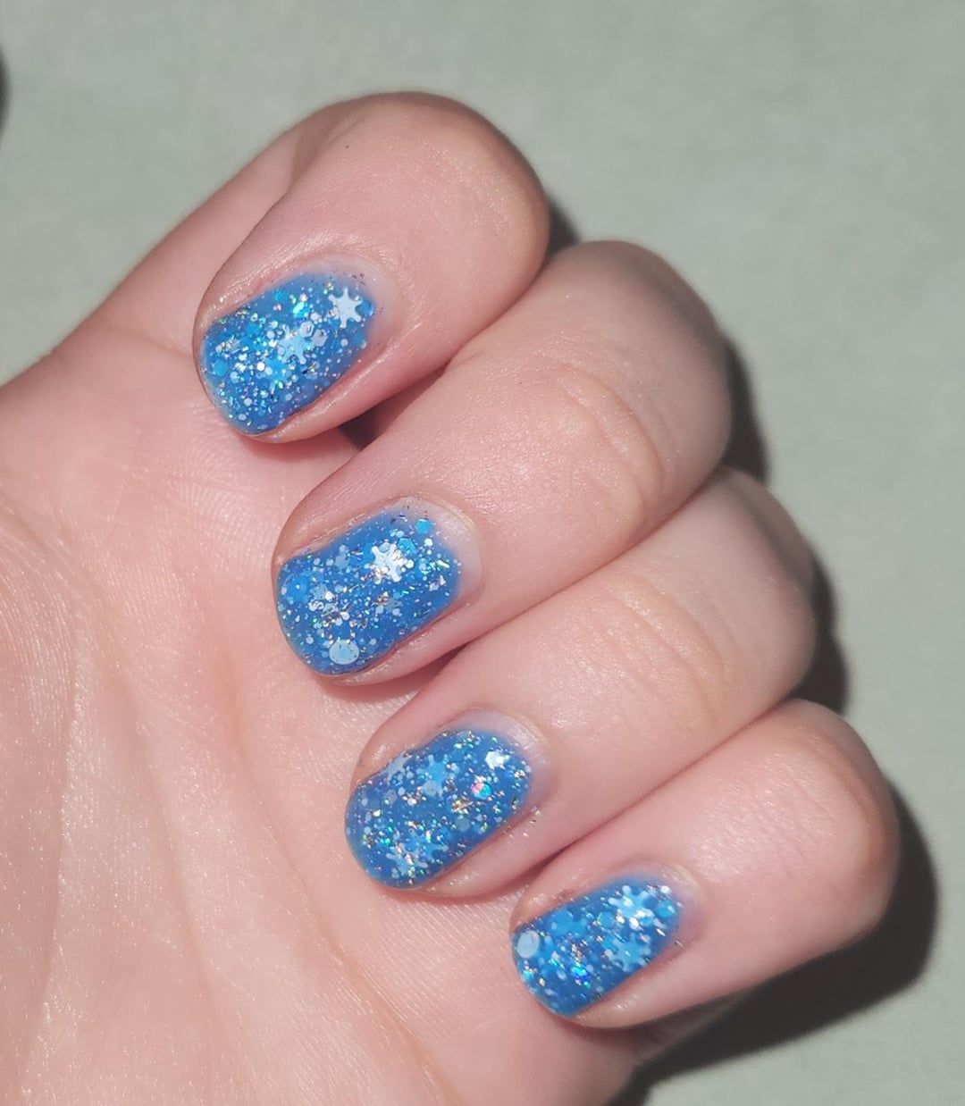 1 coat lights lacquer fill me in, 3 coats kbshimmer snow much fun, 1 coat holo taco flakie taco, 2 coats seche vive