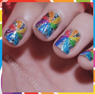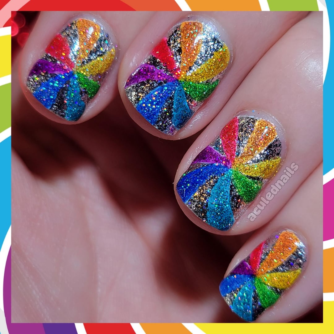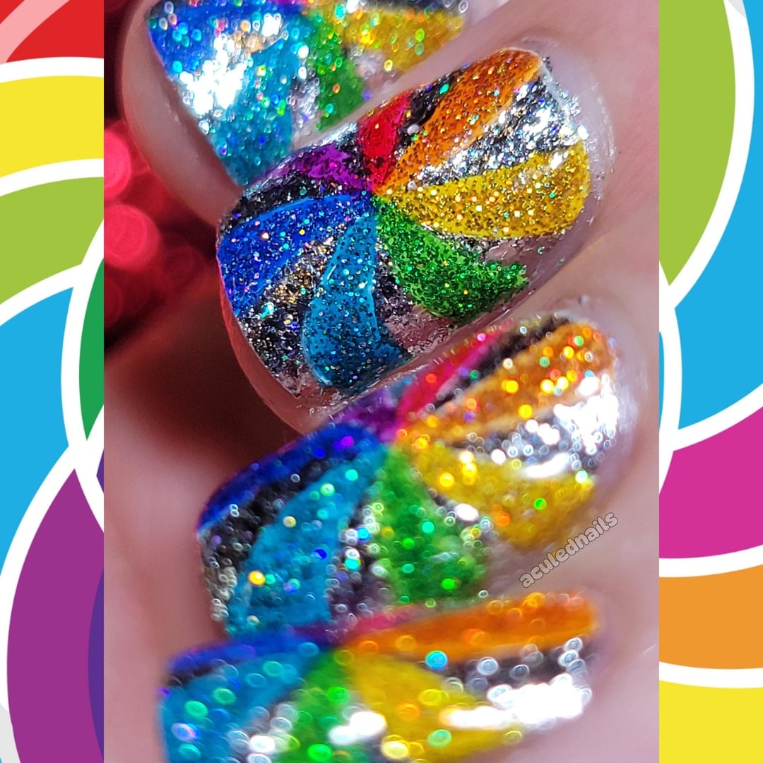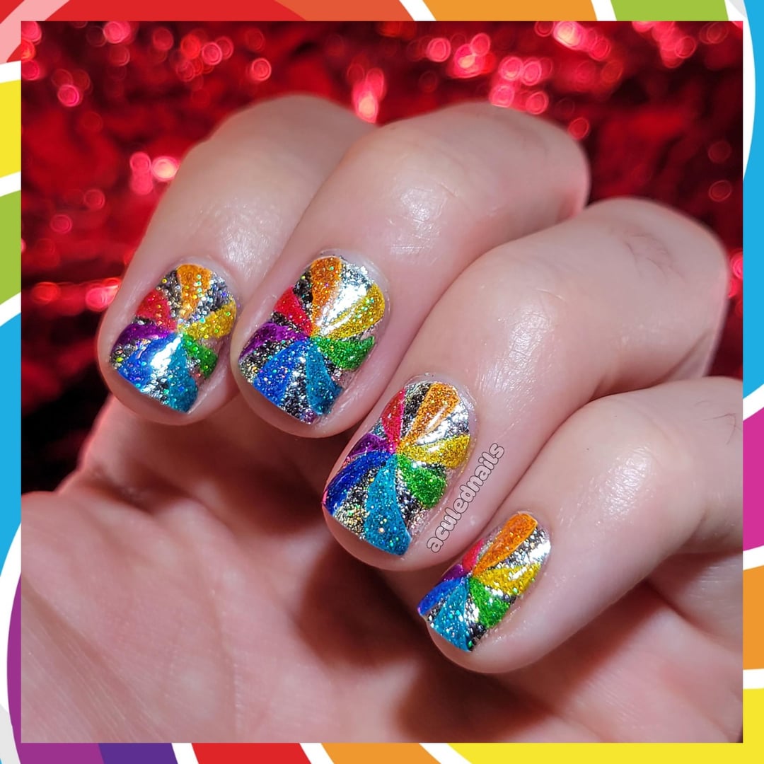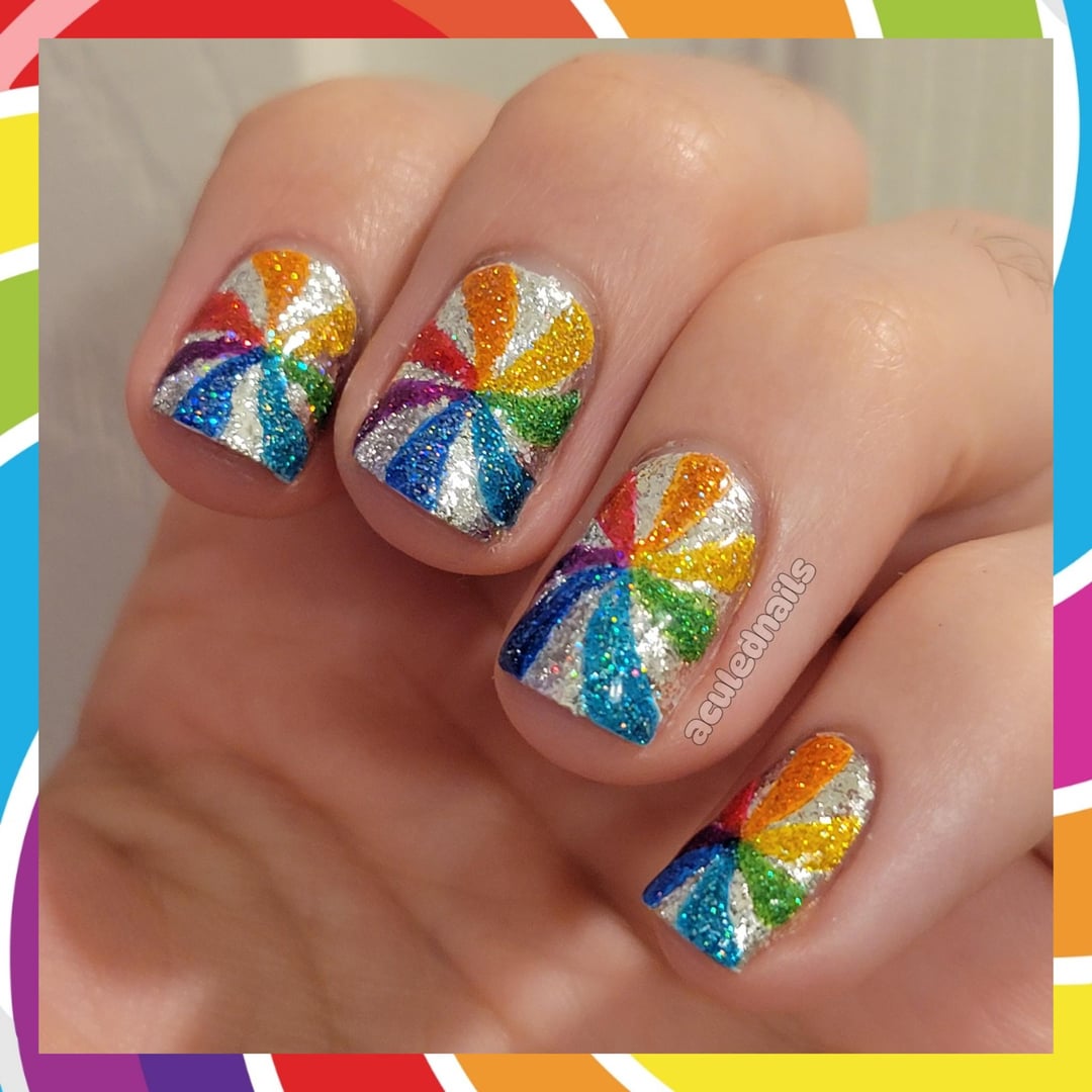 Sparkly rainbow candy spiral? Hell yes. These are legit near impossible to photograph (with my total amateur skills using a phone and making it up as I go) so enjoy some different lighting options to try and capture it 😝 The base is SO SHINY. The reflective glitters and holo in the colors are SO SHINY…I don't even know what to do with them besides stare at the BEAUTY of rainbow and shiny, all from some of my favorite brands and people ever. I used Silver Ballz as a base because I want to drink this beauty and just become chrome. Then I took a stamp of a swirl as a tracing base…layered the Arcade Reflective jellies from my love PLL, and then added the holo micro glitter from my good friend FFL…anow I have these rainbow beauties to perplex my phone camera. Gorgeousness.