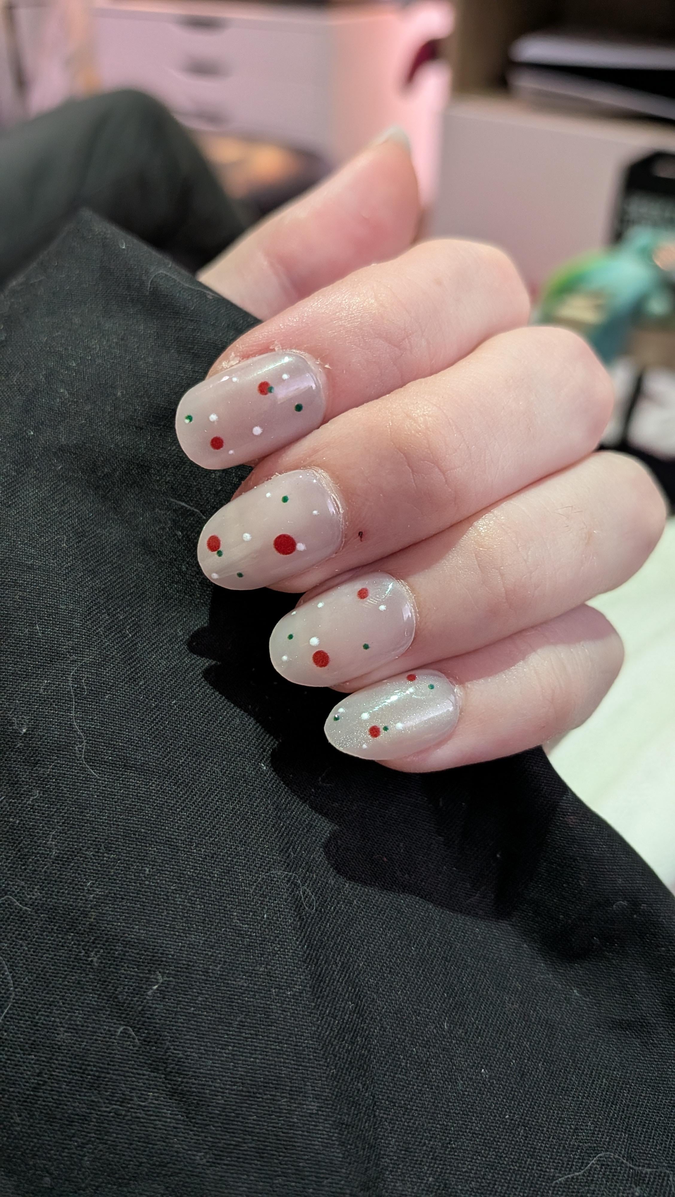 I don't think I did too badly for a first time—they're a little uneven and I can see a sharpish corner in the photo that needs a bit more filing down, but overall, I'm really happy with how they've turned out. These are definitely going to become my go-to Christmas nails, I think.