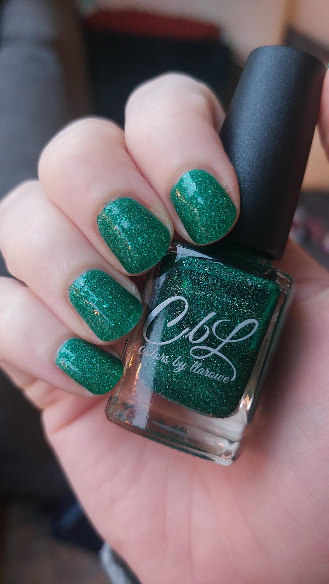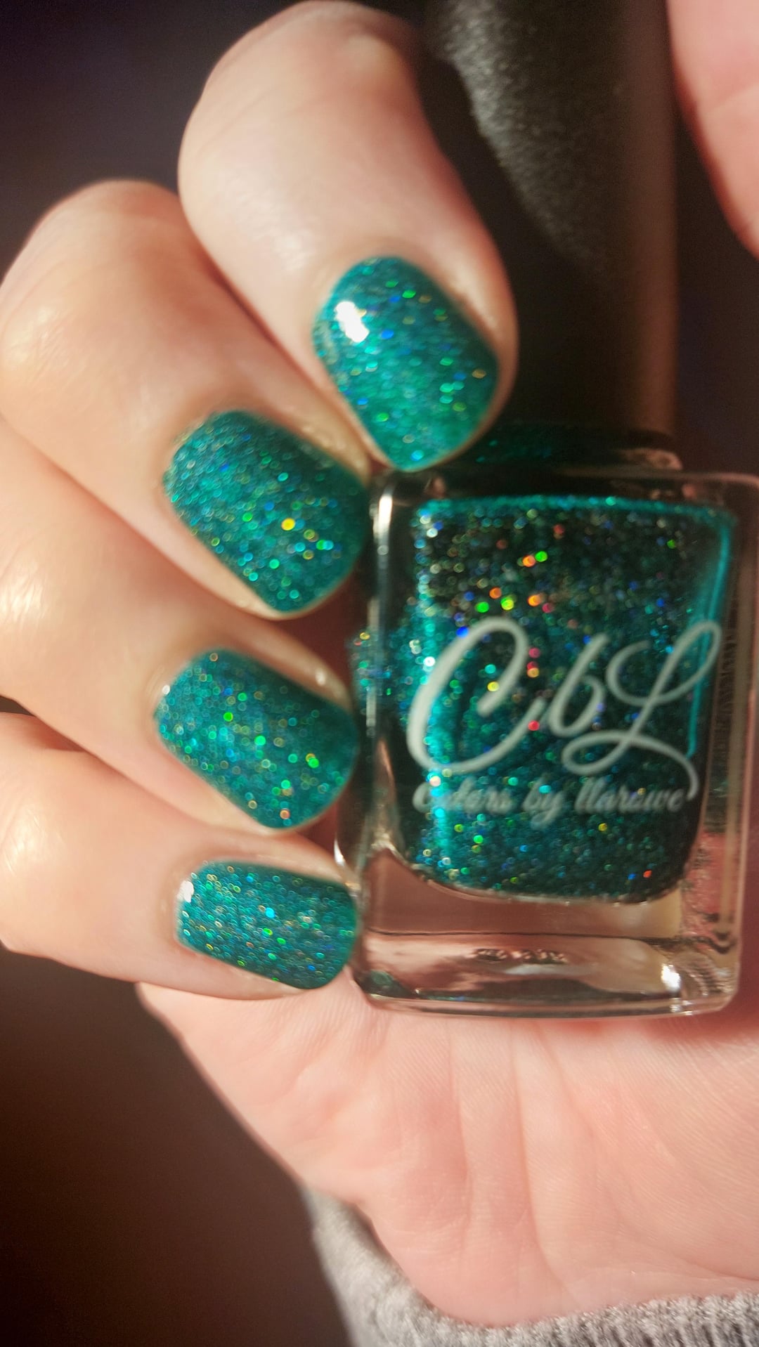 With three coats of Colors by Llarowe – Tree of Lights. Almost a blue-toned green, pretty and unique and I will 100% be detashing this because I hate wearing it lol by mirrorgirl-
