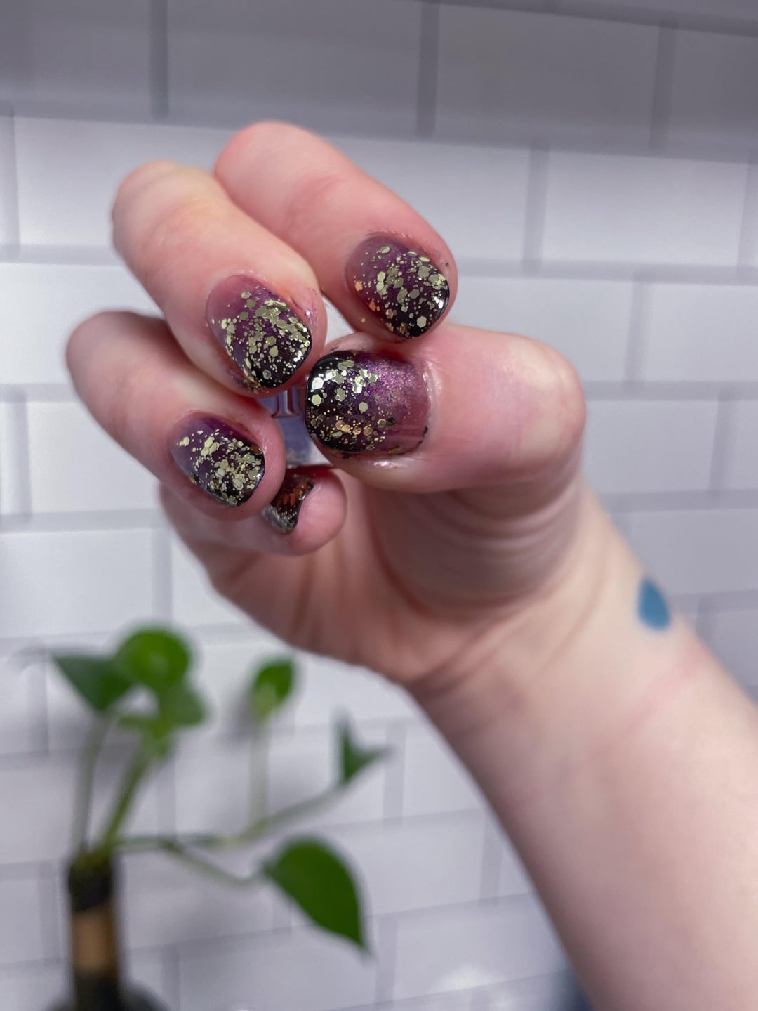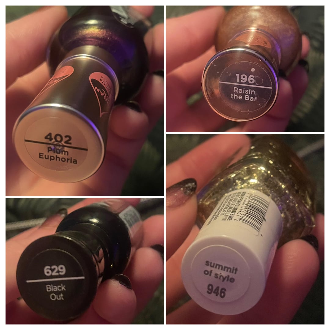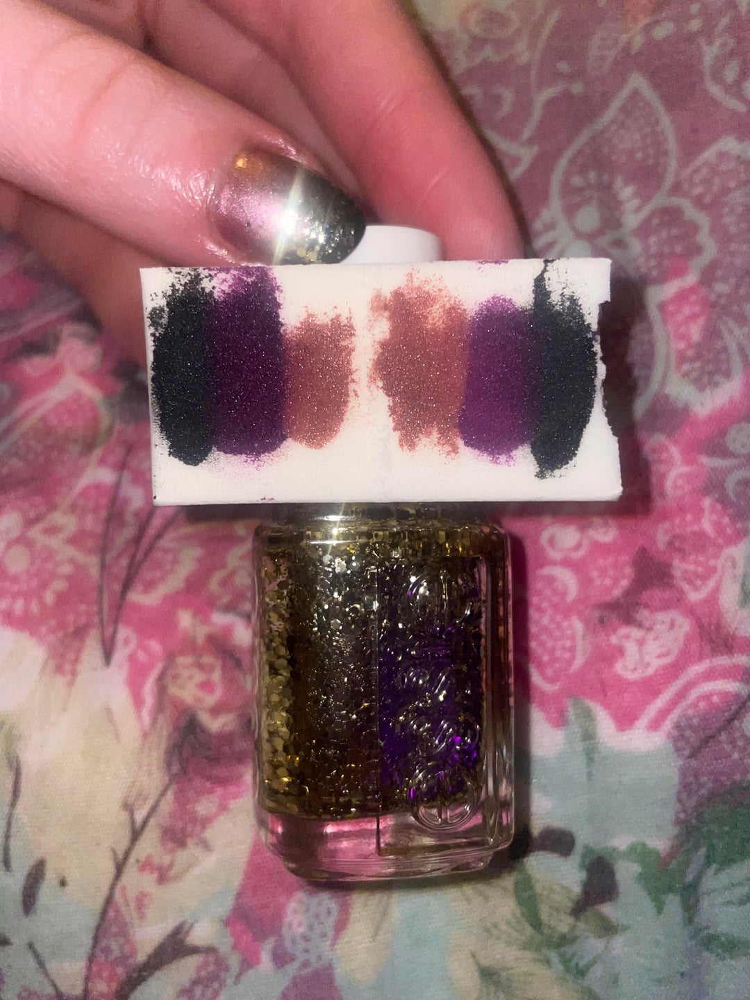 layer on wedge makeup sponge 196-Raisin the Bar, 402-Plum Euphoria, Sally Hanson Xtreme Wear 629-Black Out and stamp until desired blending
