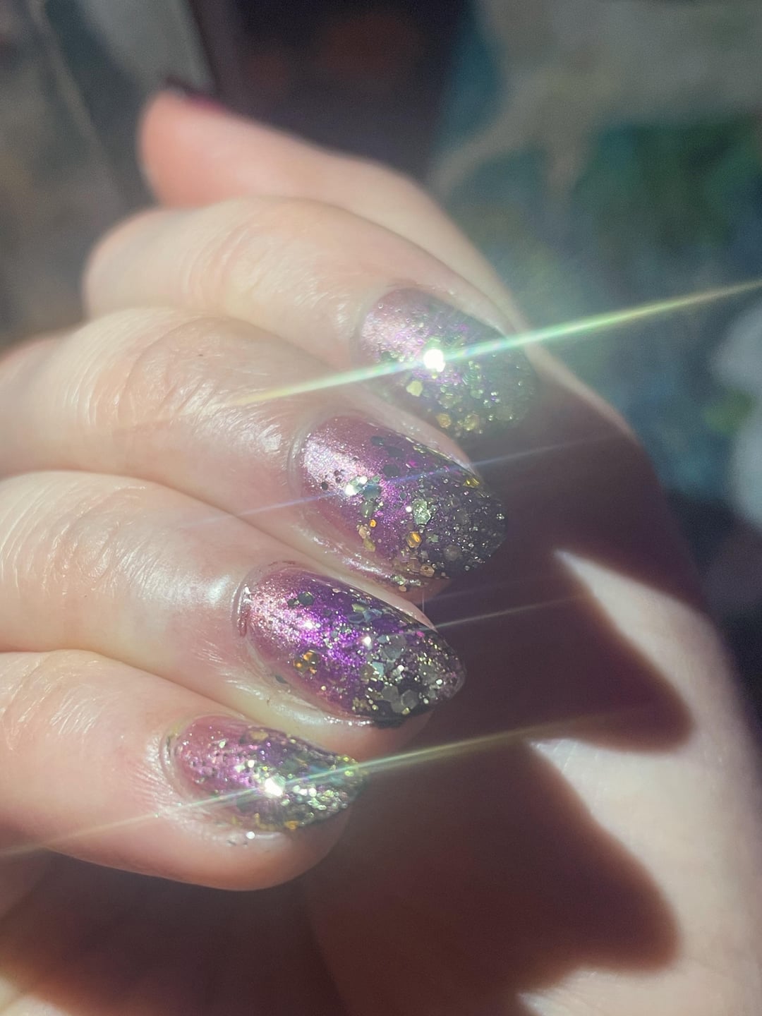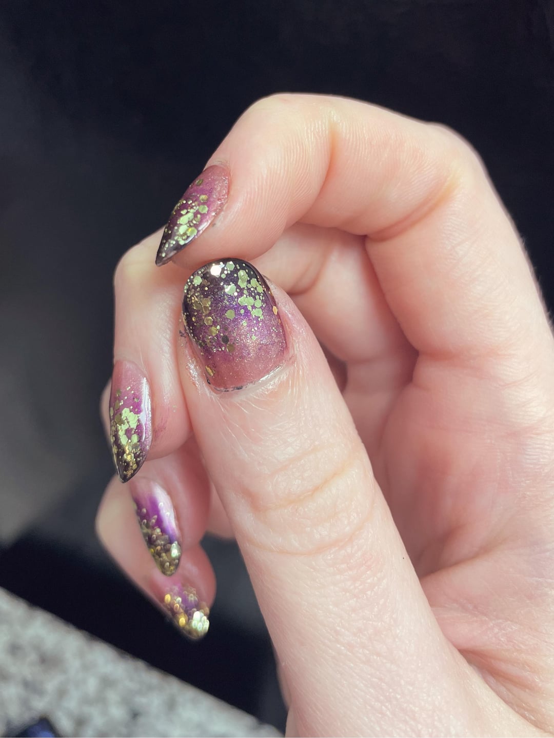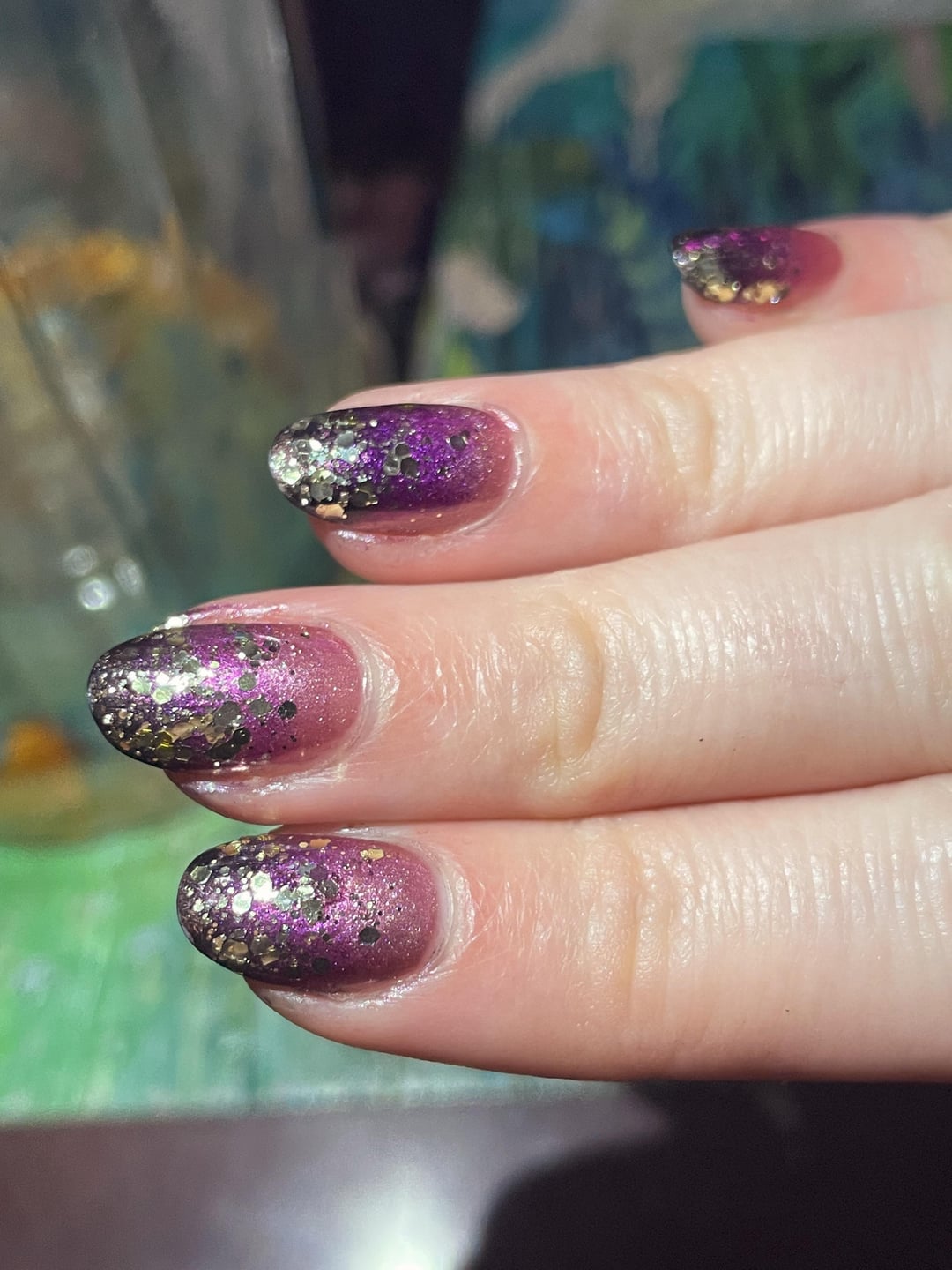 layer on wedge makeup sponge 196-Raisin the Bar, 402-Plum Euphoria, Sally Hanson Xtreme Wear 629-Black Out and stamp until desired blending