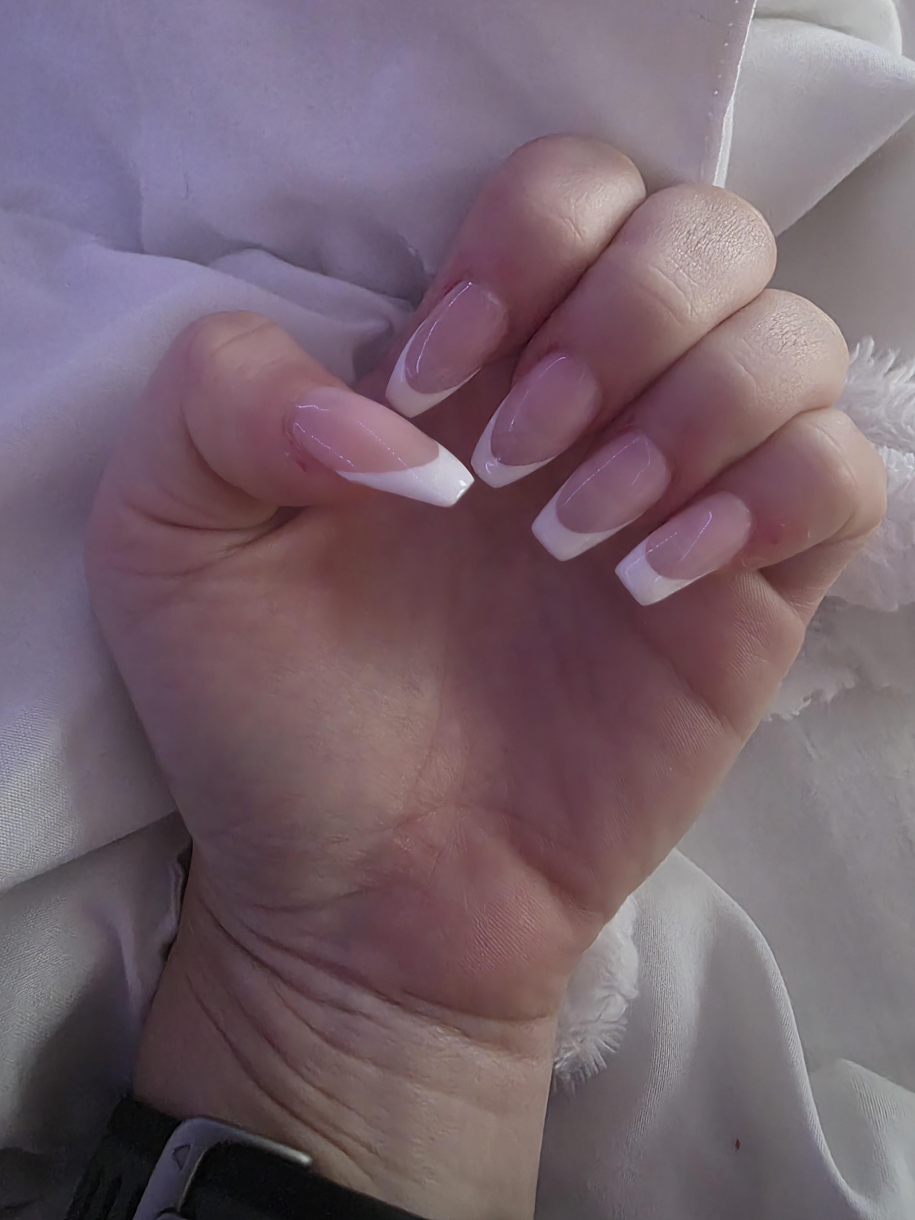 Your friend is ghetto and trashy. Normal but picky critique would be your index and middle finger are rounder than the other fingers and they did a more modern French than classic but that’s just me being again, picky.