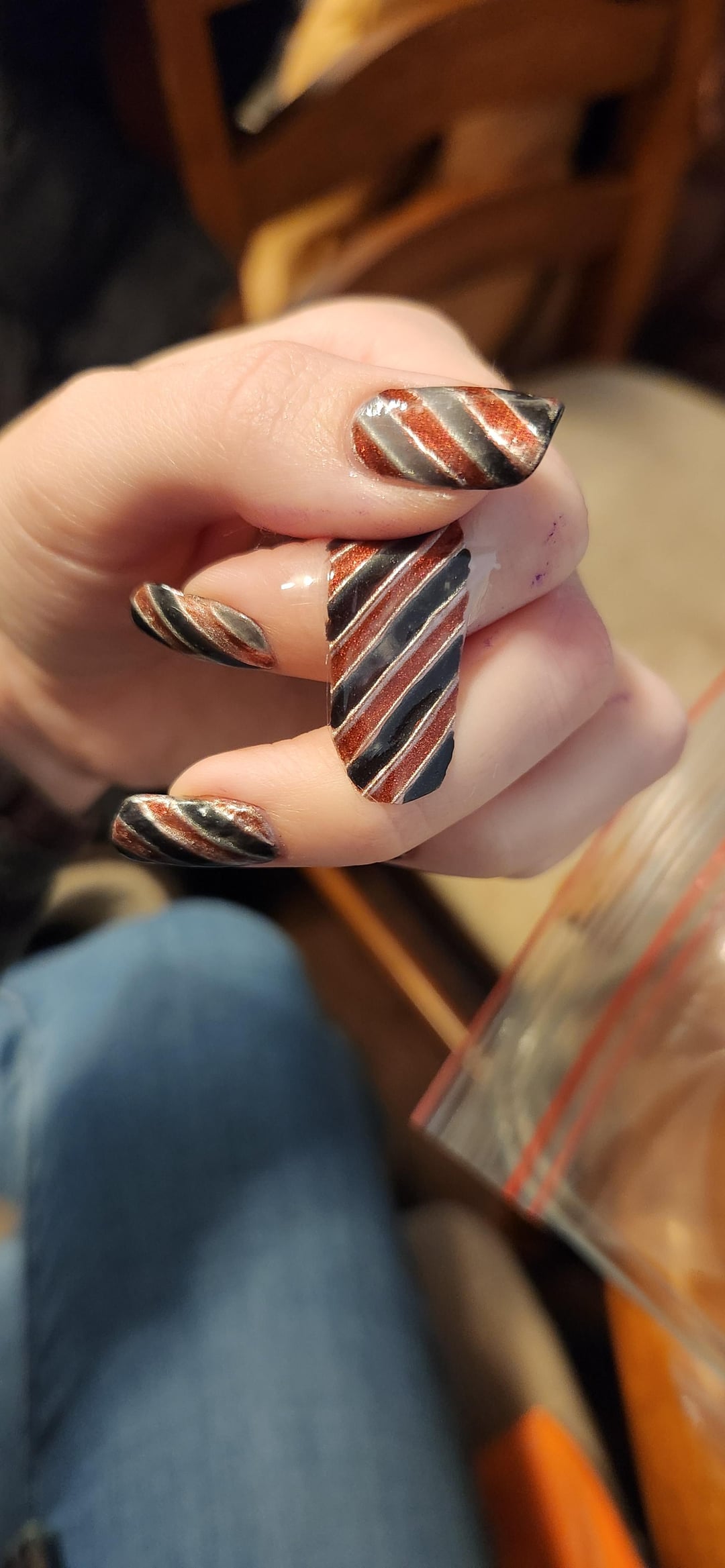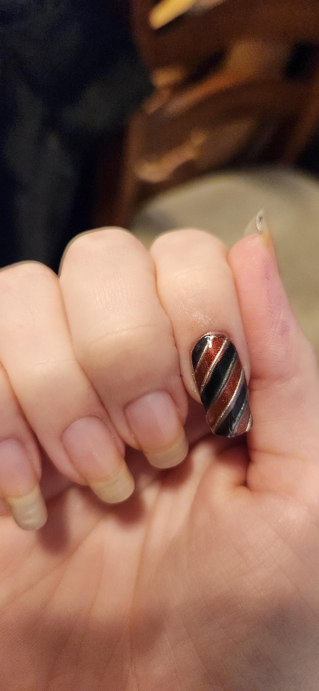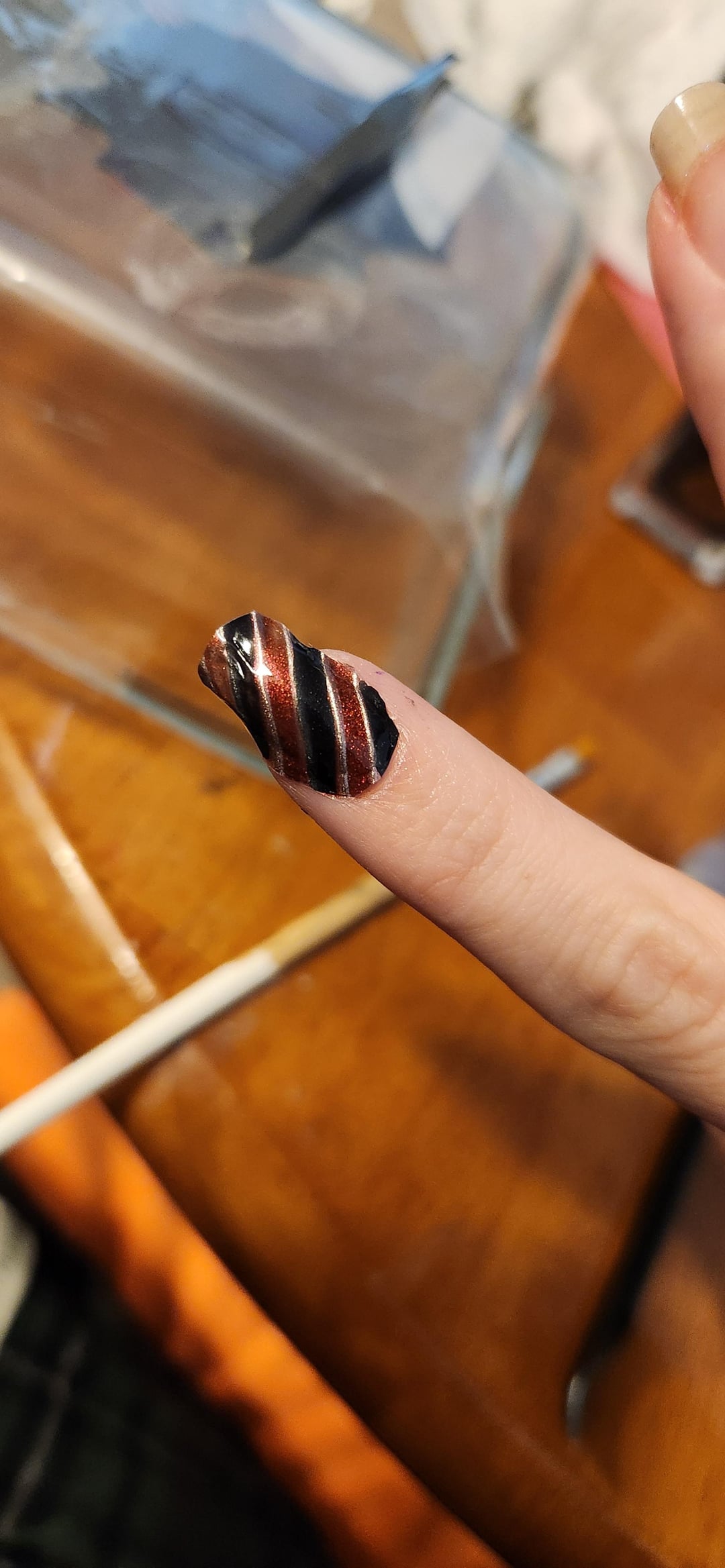 8.) If you want to clean it up very gently apply color 1 along the magnetic area, to put those particles on top and make that the predominant color. You can also clean up any color creep if it happens. Then cover with top coat. As you can see once you do that it crisps up real nice! I brush in the direction of the stripes to help keep things oriented that way.