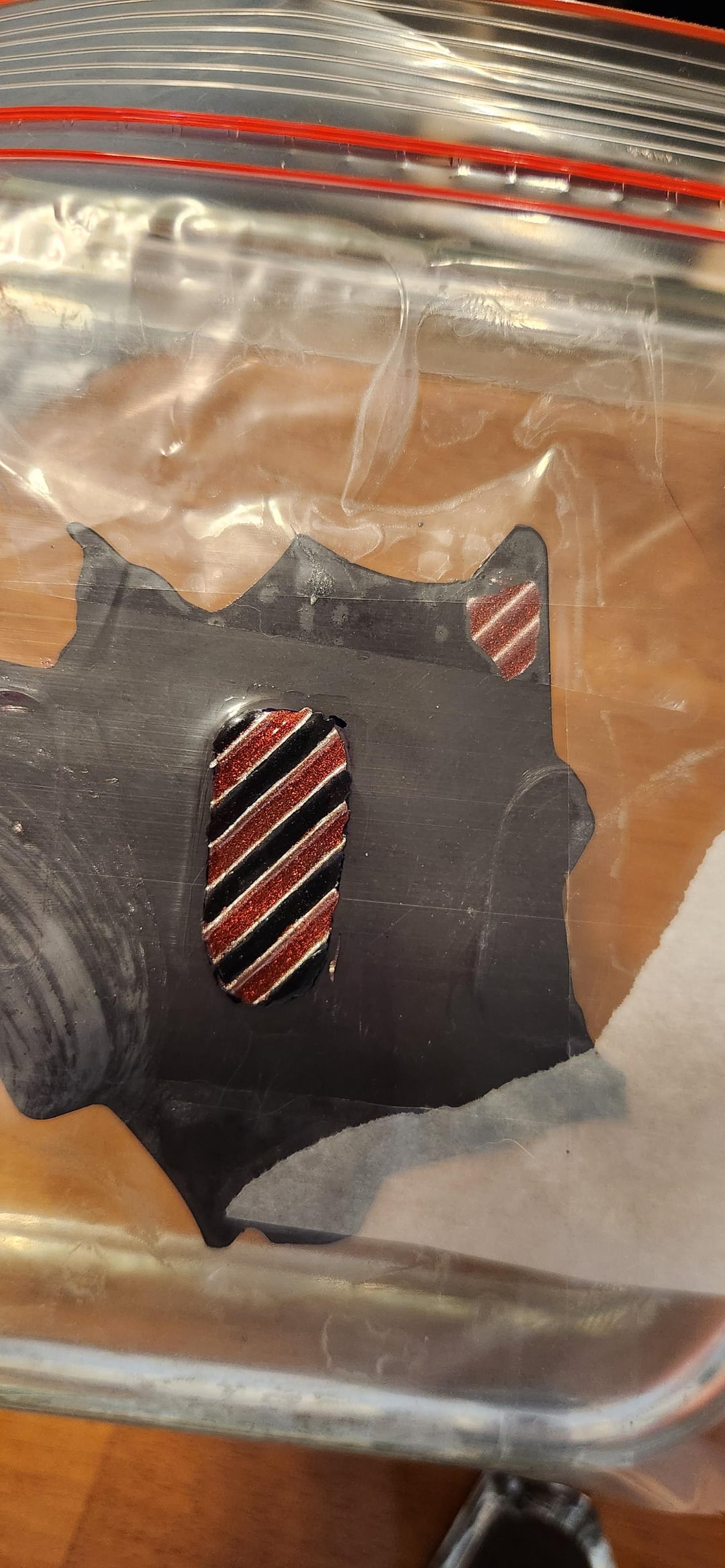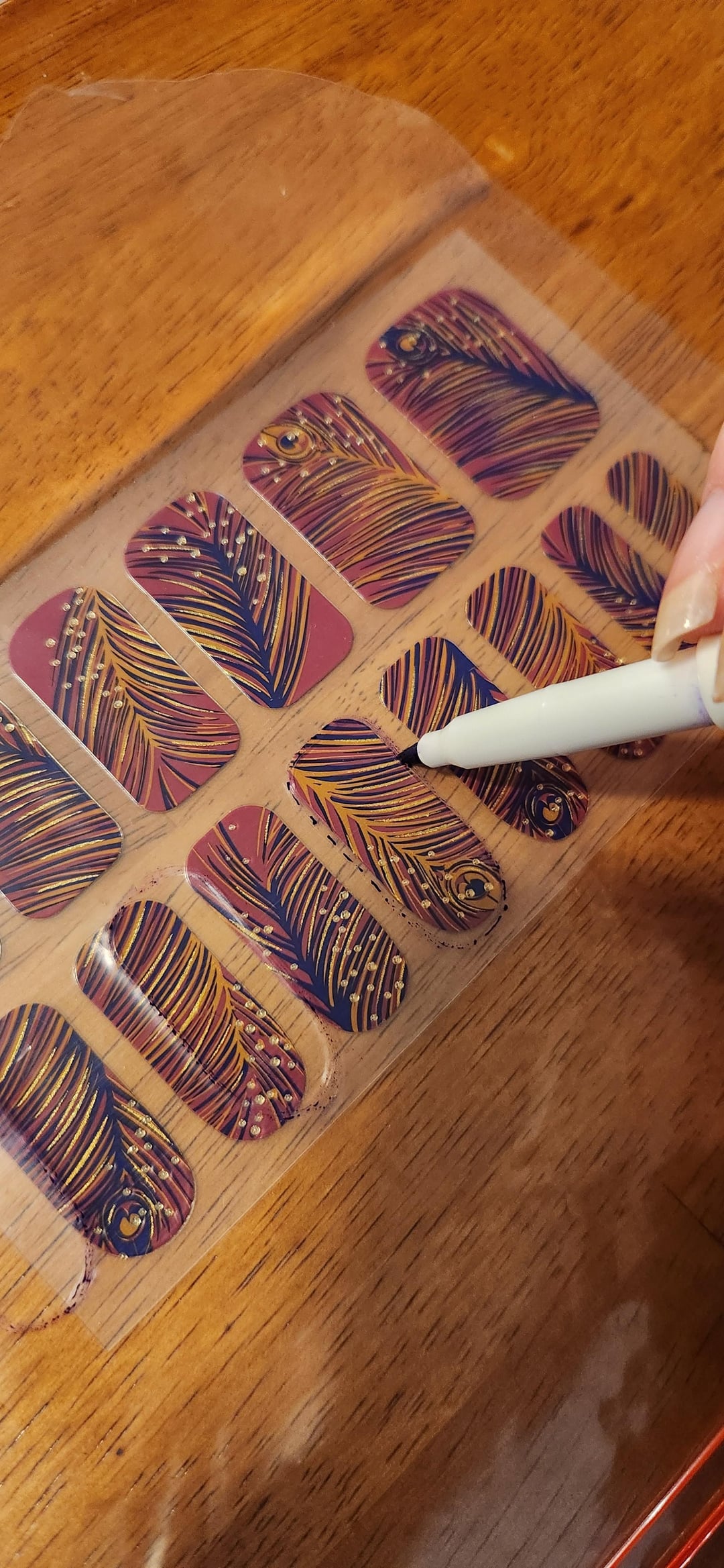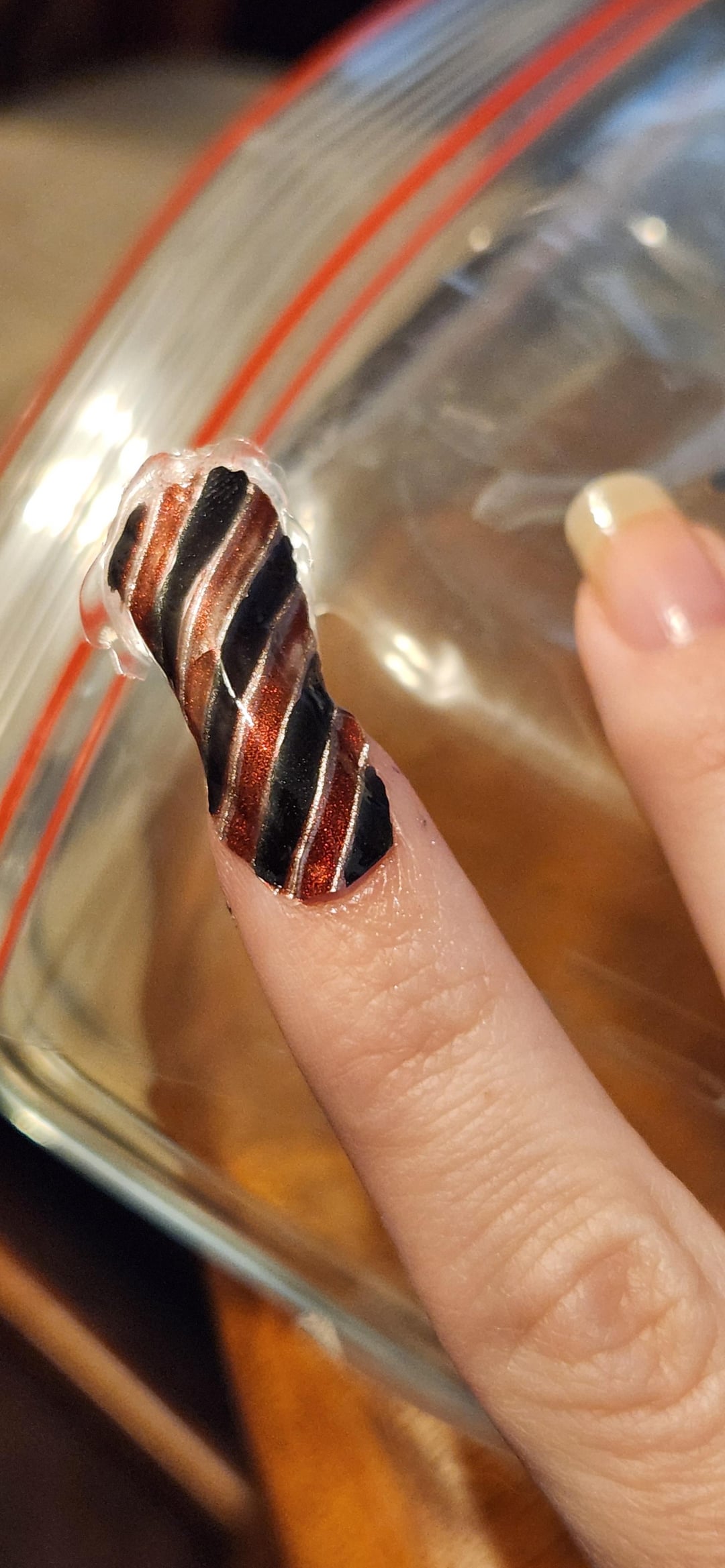 10.) Use your fingernail to lift and peel the decal off. Too soon and it will stick, or pucker. Both will mess up the magmetic effects. Ideally it will peel of smoothly, without resistance, and be lightly sticky. do not touch it to your nails accidentally, it will stick and you will be upset. It should also be limp and wiggly. Perfect amount of cure.