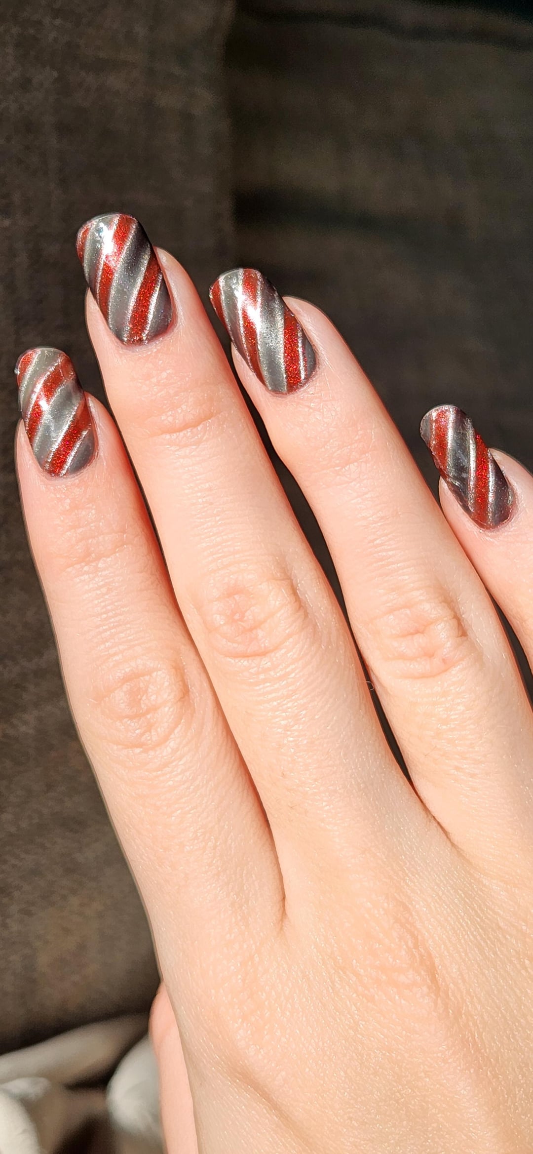 7.) Take color 2 and your fine brush and very carefully fill in the other stripes without going into/over the magnetic stripe.Now if you have a lot of polish on your brush it can disperse into or past the magnetic stripe. I chose my color 2 because the magnetic pull was nearly the same and the overlap would be less noticeable. I have noticed that the magnetic particles blend a bit anyway and that in certain angles they will look more like color 2 and in others color 1. I specifically wanted color 1 only so I did my best to not have color 2 be painted in the magnetic pull area at all.