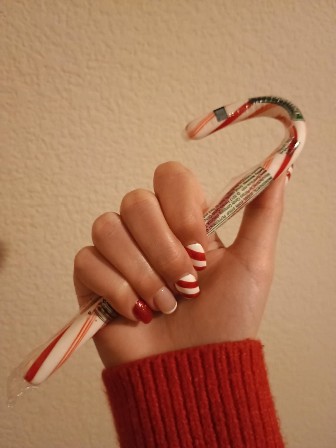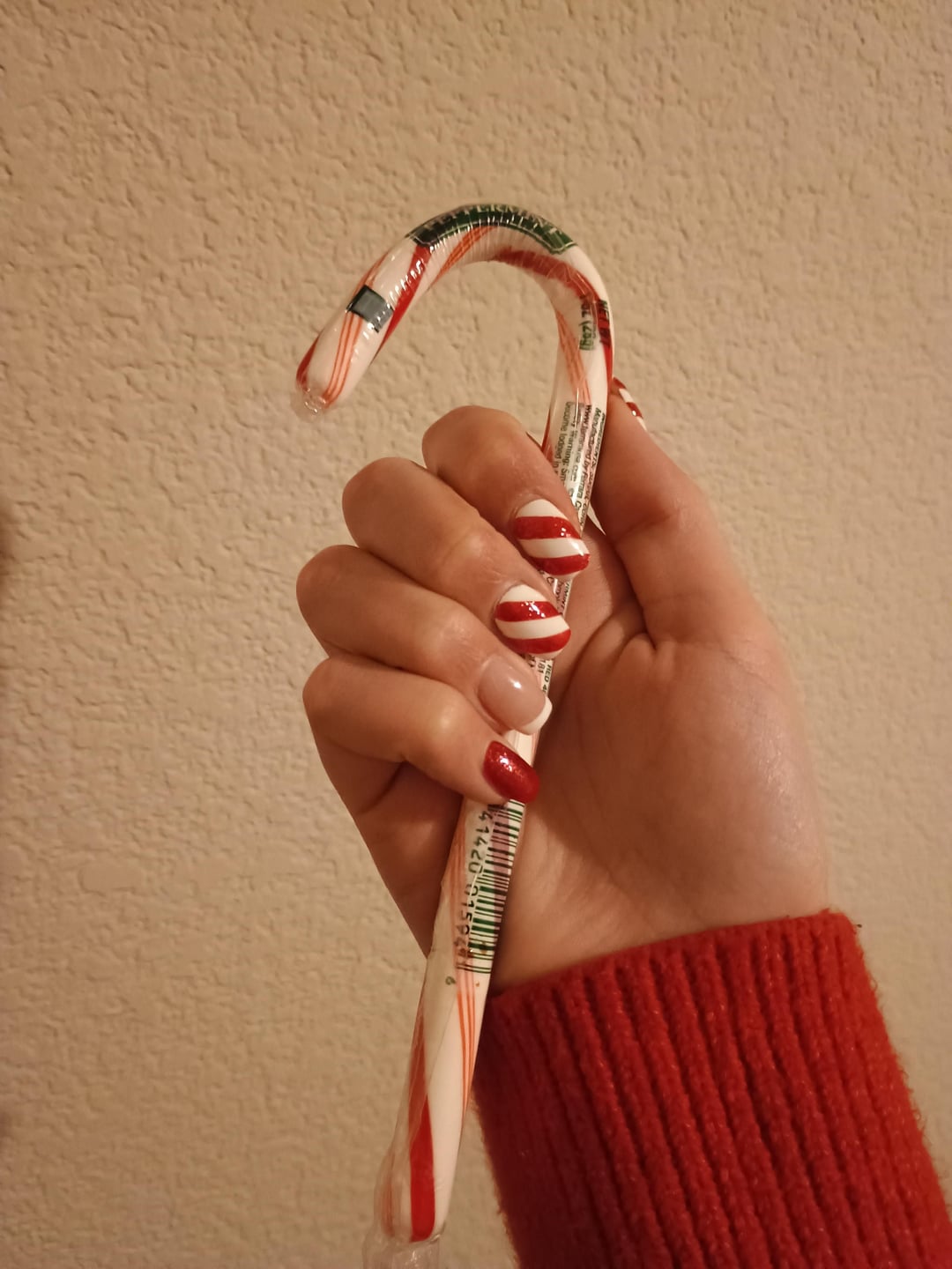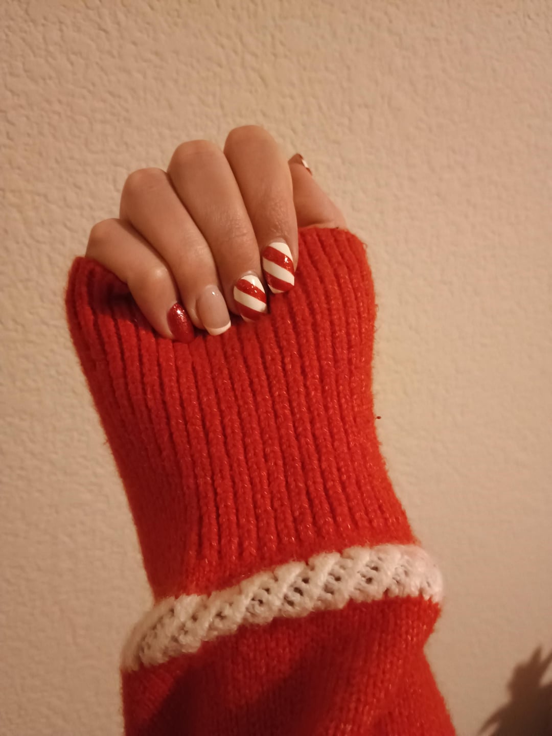 EmberEcho1289 on December 26, 2025 3:13 am Damn, this looks really cute and adorable. The candy cane nails with the red sweater combo is perfect. Simple, festive, and super clean holiday vibes done right.