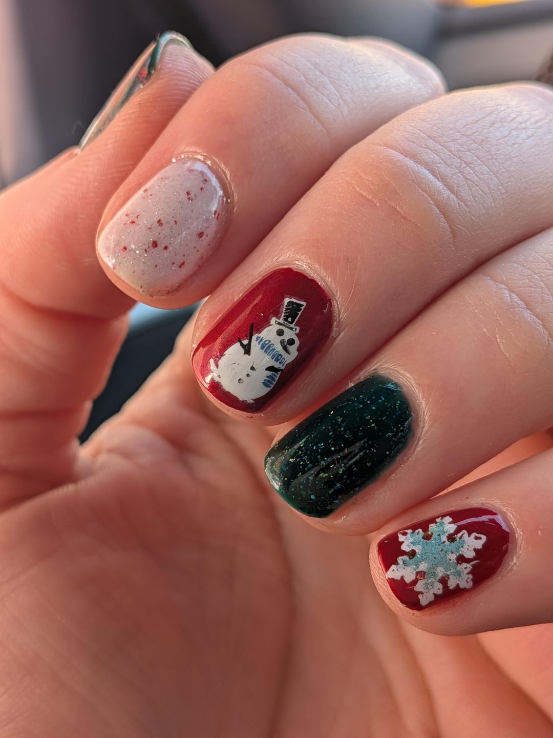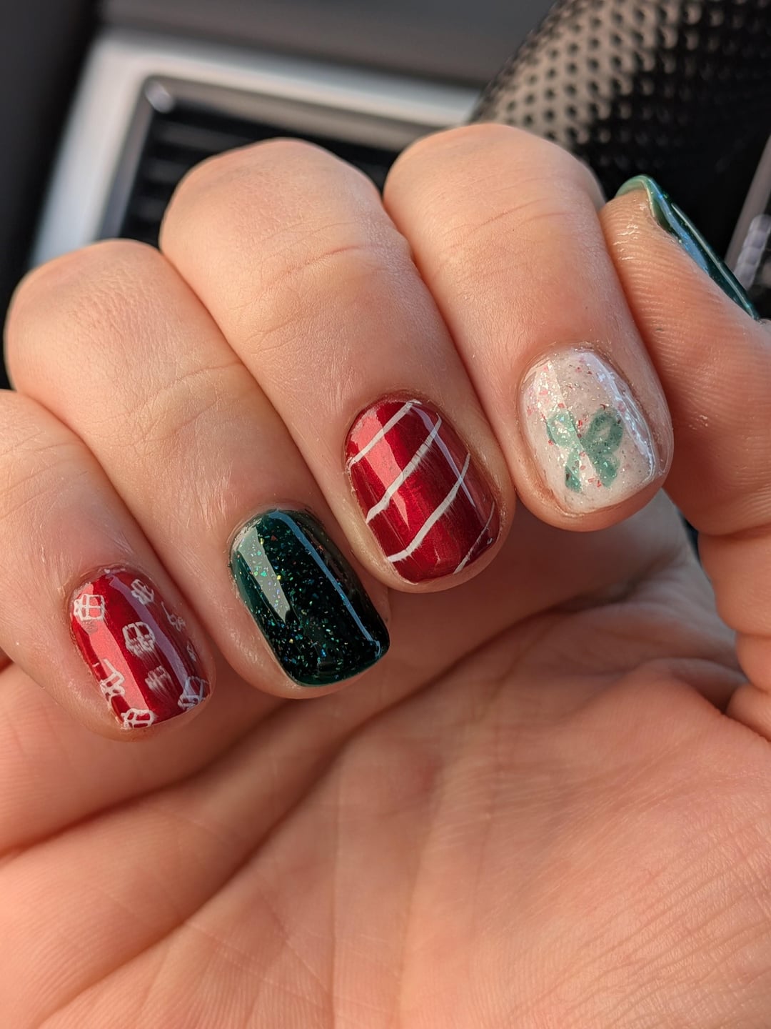 The red polish is 23 Flavors by Cracked and the white is Flurry by La Colors, green is Noel by ILNP and the white/red flakie is North Pole by ILNP. by turbomama16