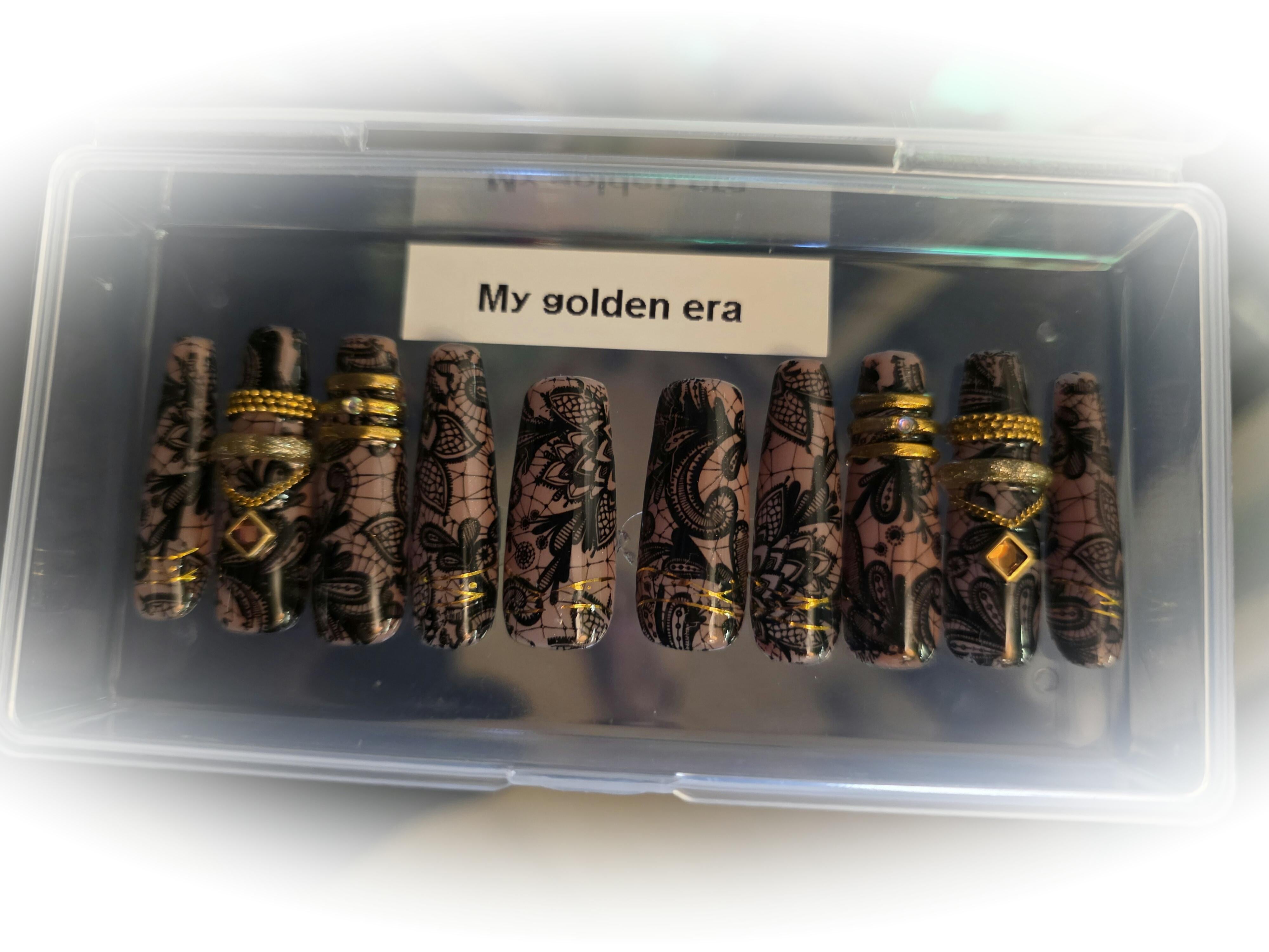 Was this color combination not a good idea? I thought a dark background would soften the gold accents a bit, but now I have the feeling that they "disappear"? And yes, I know bangle nails are out but I'm still practicing my nail art 😊