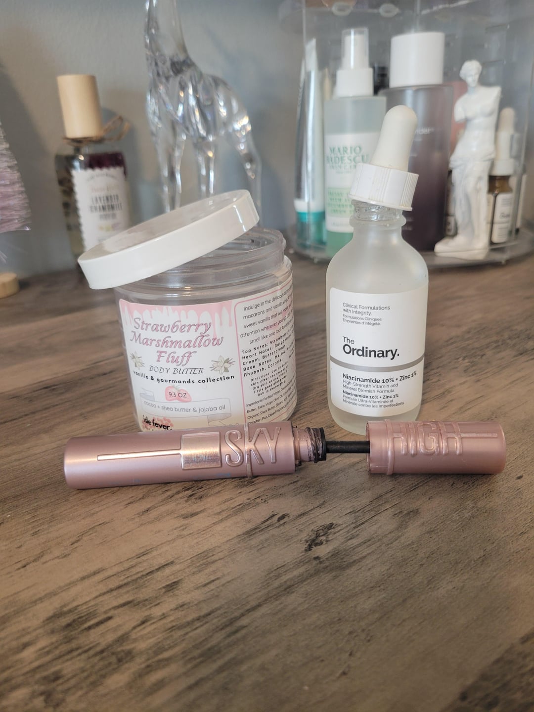 🌿 products: isle fever body butter // the ordinary niacinimide zinc 10% // maybelline sky high waterproof // mario badescu lip mask
