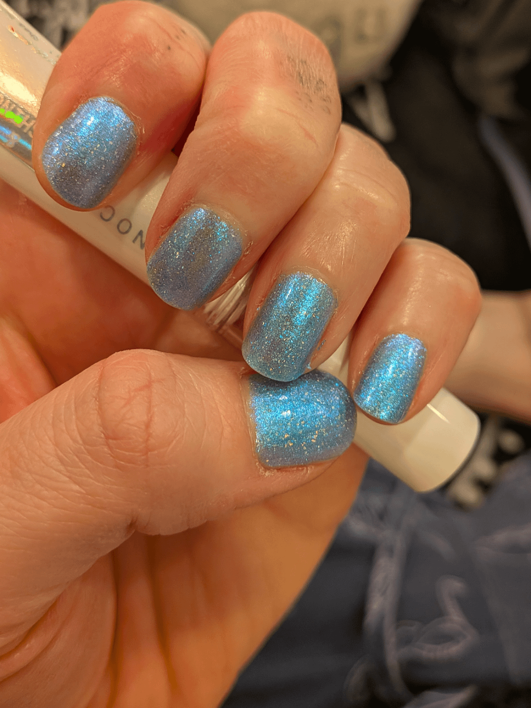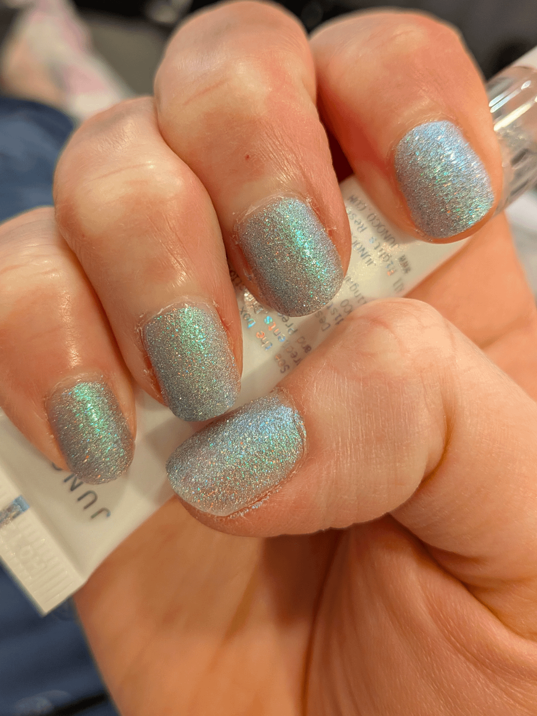 Got this from my December PPU and I am a huge Twilight fan so when I saw this I screamed. I also really like this Blue Bird so when I can't decide what color to do, I do both….no reason to force myself to decide when I got two hands 😏. I don't like how gritty it feels so waiting for my second layer of topcoat to dry to see if thatll help. Don't mind my dry cuticles. Photos don't show how sparkly they both are.