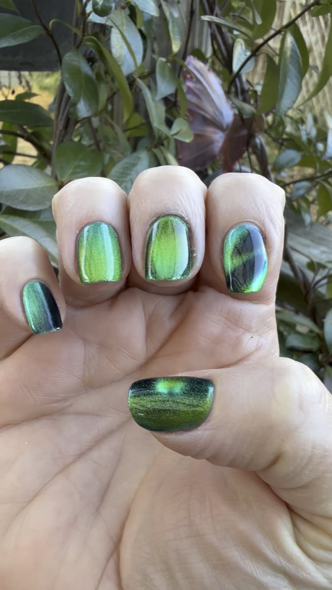Cirque Colors’ Mood Ring will be my next manicure but I wanted to swatch a few different options for magnetizing it before I commit to a method. Here is what I did for each nail. I’ll post a pic in the comments. For this swatch, I used three coats of Mood Ring. No base or top coats.