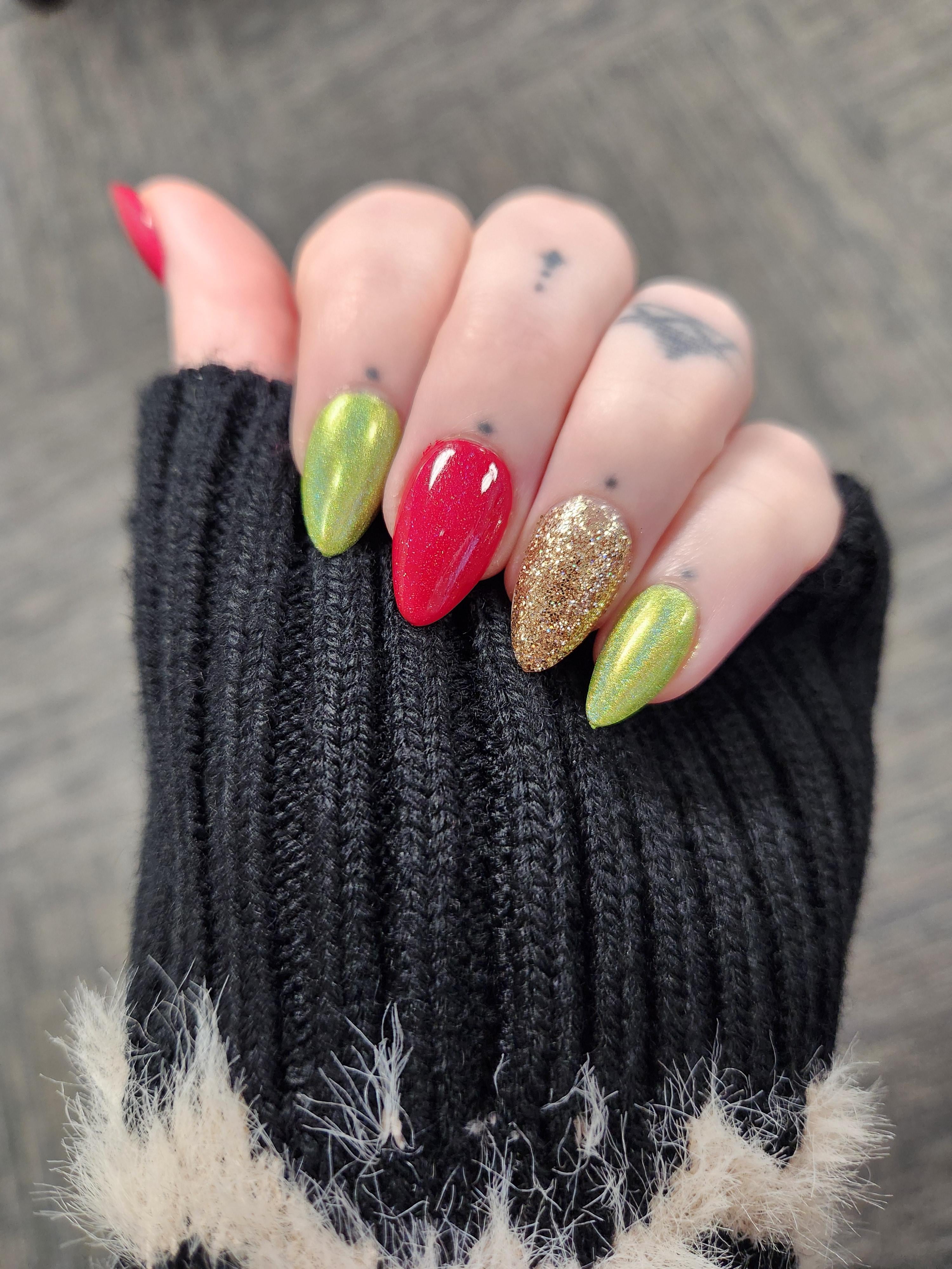 Thumb + middle- Opi big apple red topped with ILNP my private rainbow