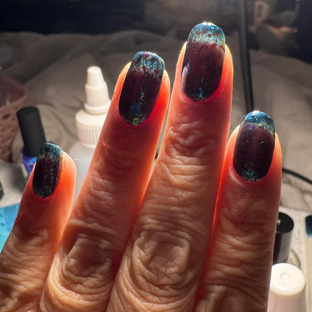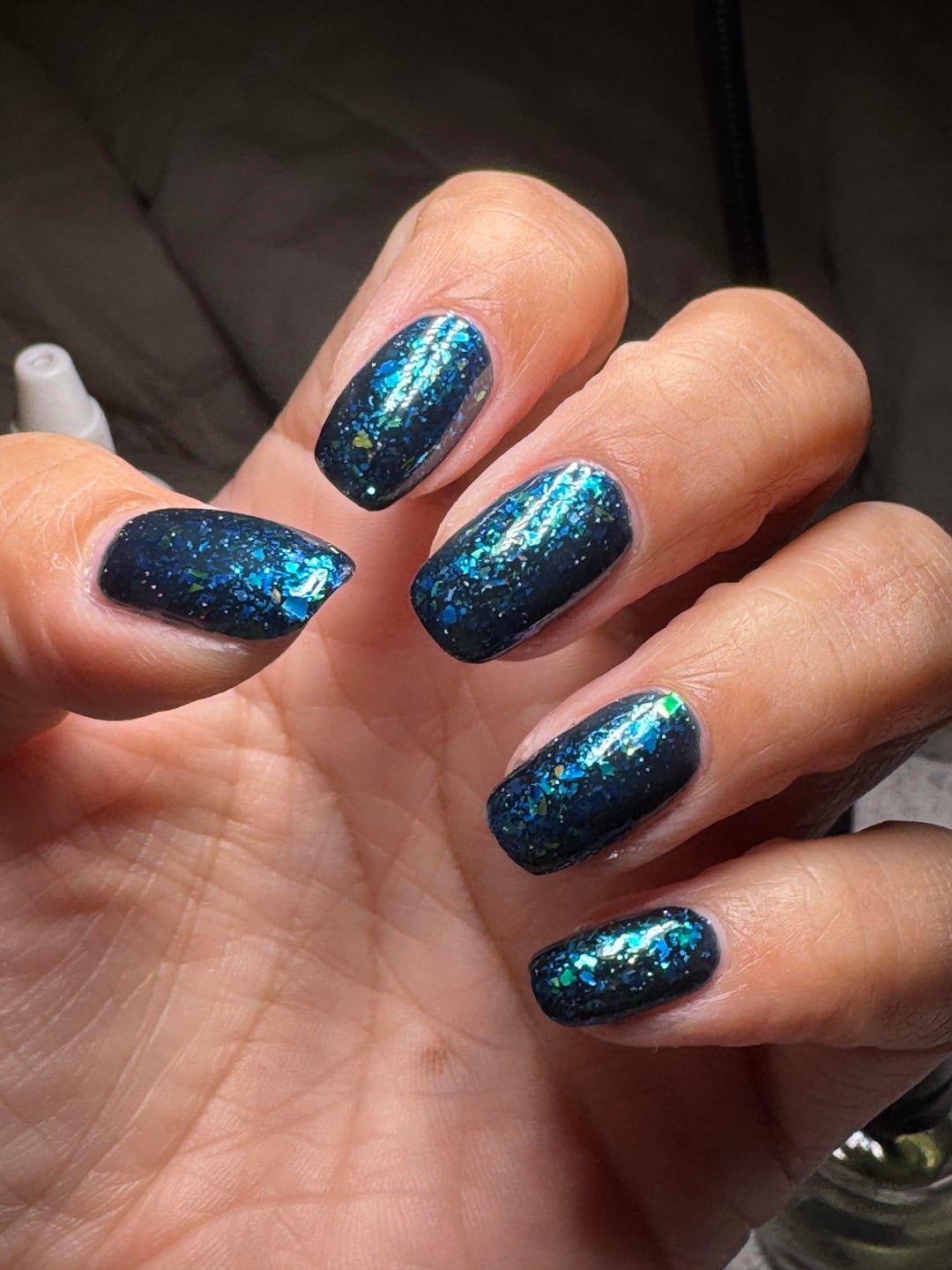 Just got this in yesterday and HAD to change polish immediately lol – 2x OPI Nail Envy – 1x KBShimmer Stay Put Hydrating Base Coat – 2x Holo Taco Seek Kelp – 1x Sally Hansen Insta-Dri top coat (red bottle) by InvestmentMedium2771