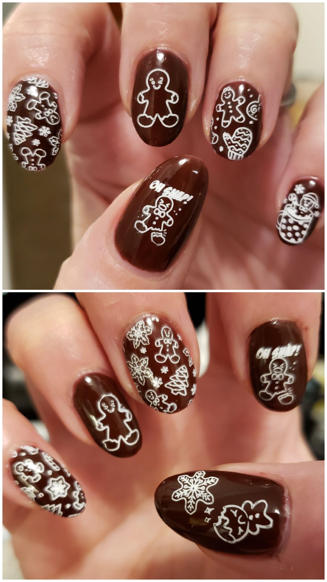 I’m stubborn so I carefully dabbed off as much as I could with a barely damp cleanup brush, let the surface dry, carefully brushed a little chinotto back over the smeary part, and more top coat. Hey, it worked! 🤣. You can still see part of the smear next to the ! In Oh, snap! Which is kind of appropriate. 🤣 but yay I didn’t have to redo the whole nail. 🤪