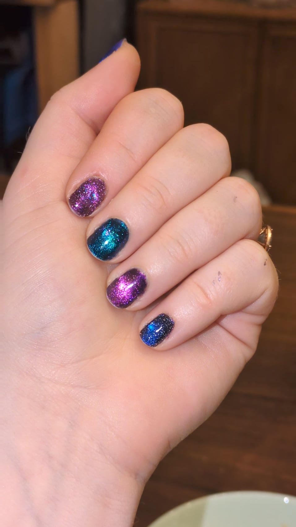 Beads were achieved using the "tiny bead" method, rotating a regular bar magnet back and forth by 90 degrees every five seconds (so functionally making an x with the magnetic stripes, which will concentrate into a bead.) After my PPU glass bead contraption broke, I was so excited that this technique worked, as it's a billion percent less work. I magnetized each nail for 20-30 seconds (way less time than I usually do, so the tiny bead would expand) after the second coat of color, then again after topcoat.