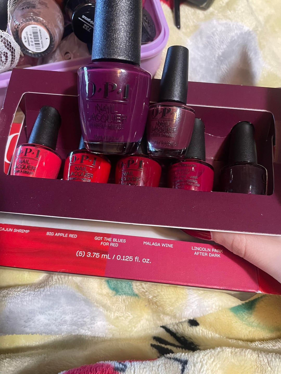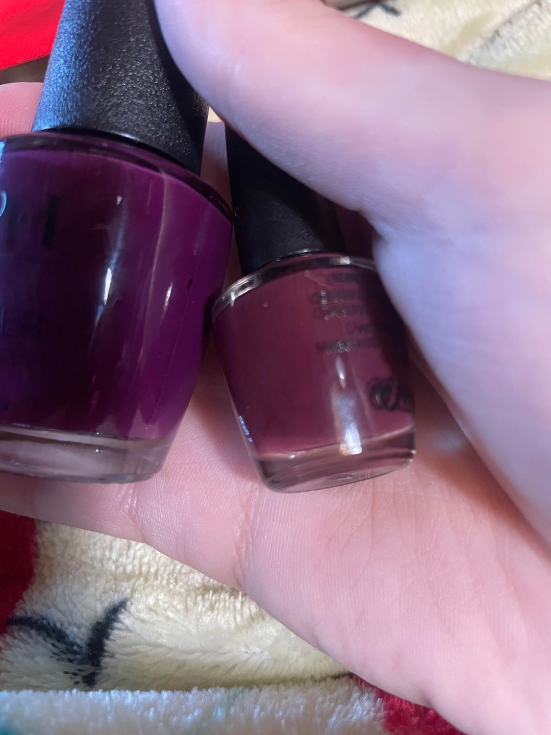 I have been trying to track down this mini OPI polish for over a year now with no success. I bought a few bottles of it from a dollar store with no packaging / labels. The top suggestion in the past was “in the cable car pool lane” (pic 3) but it is more purple than the mini. I’ve also looked at “complimentary wine” but it is more red. I keep finding ones that are so close but just not a match. I included the pics with the mini set to give a reference of color compared to other burgundy’s and reds. I would be so so appreciative for any suggestions!!