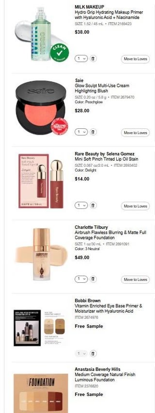 So far, I own: Huda Beauty Easy Blur Foundation (140G), Too Faced Born This Way Concealer in Almond, a Huda Beauty blush, Charlotte Tilbury setting spray, Rare Beauty highlighter and contour, and a Summer Fridays lip balm.