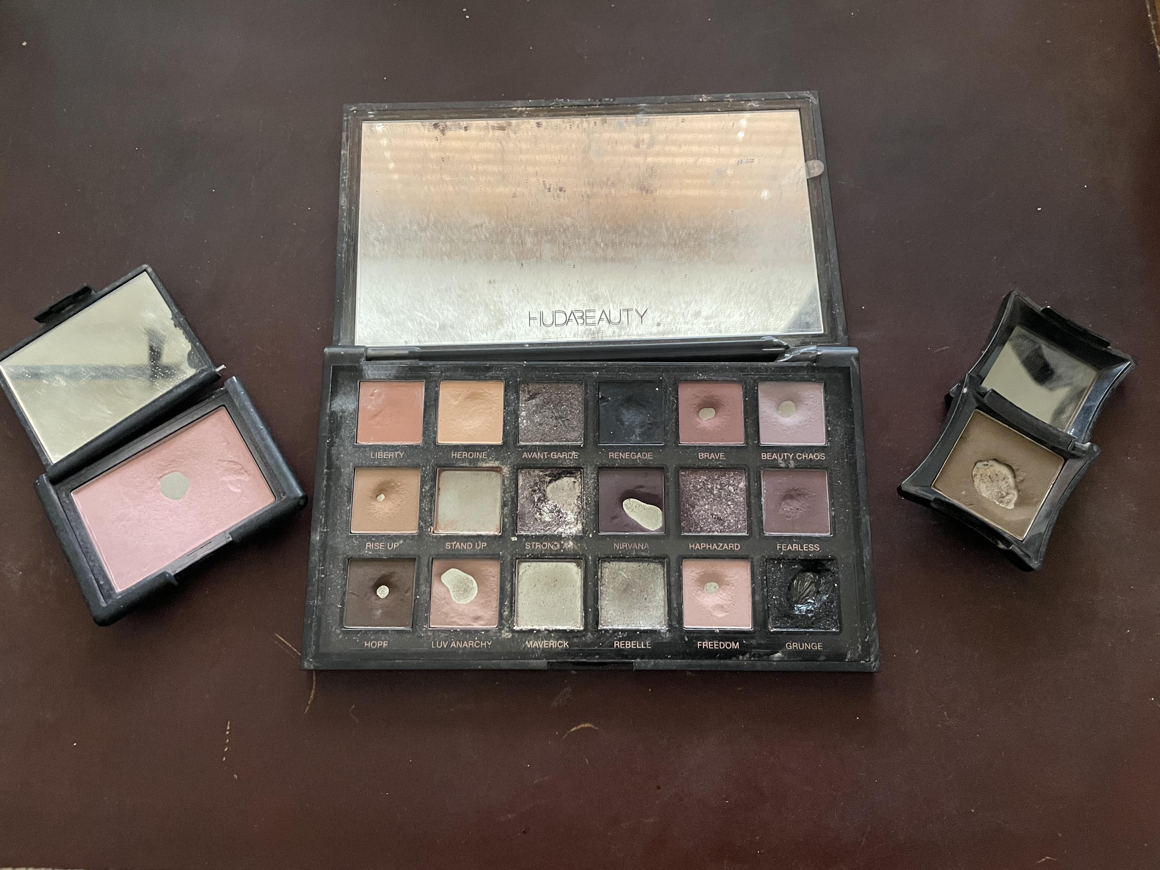 Nars blush in Impassioned, Huda Pretty Grunge palette, and Illamasqua brow cake in Thunder. All with broken hinges, and always the left one (though on the Nars the right one eventually fell off too) by gutterjelly