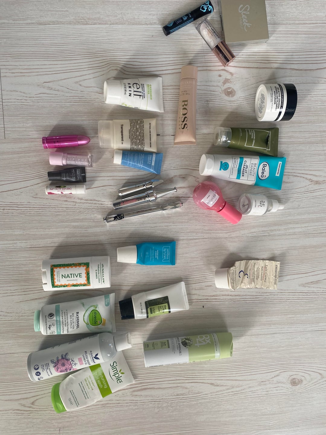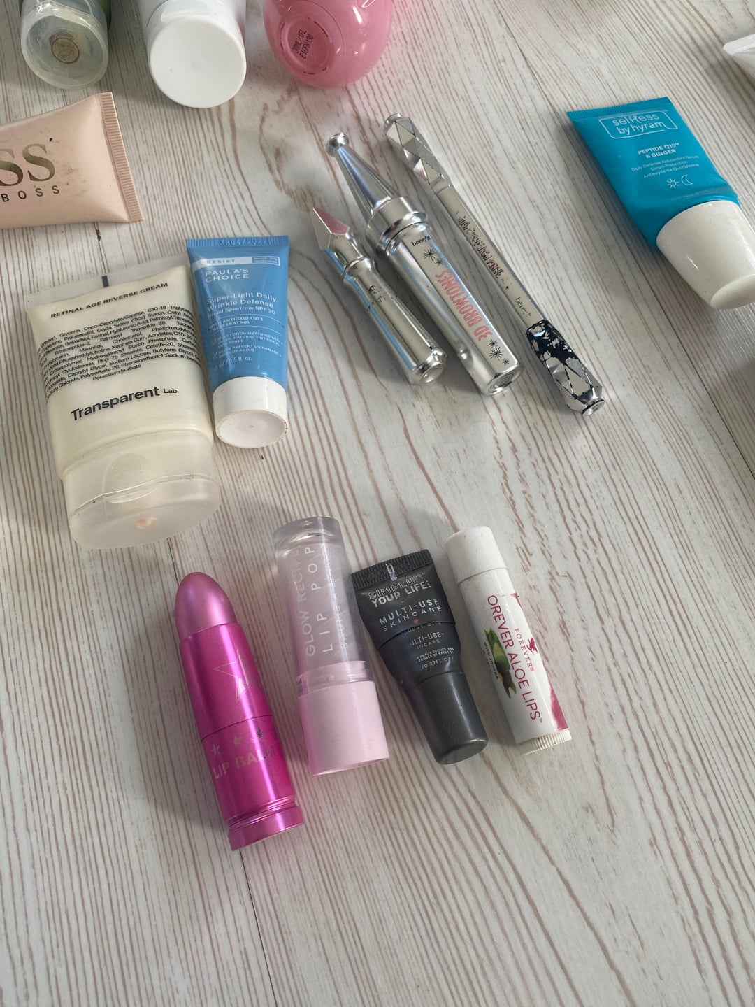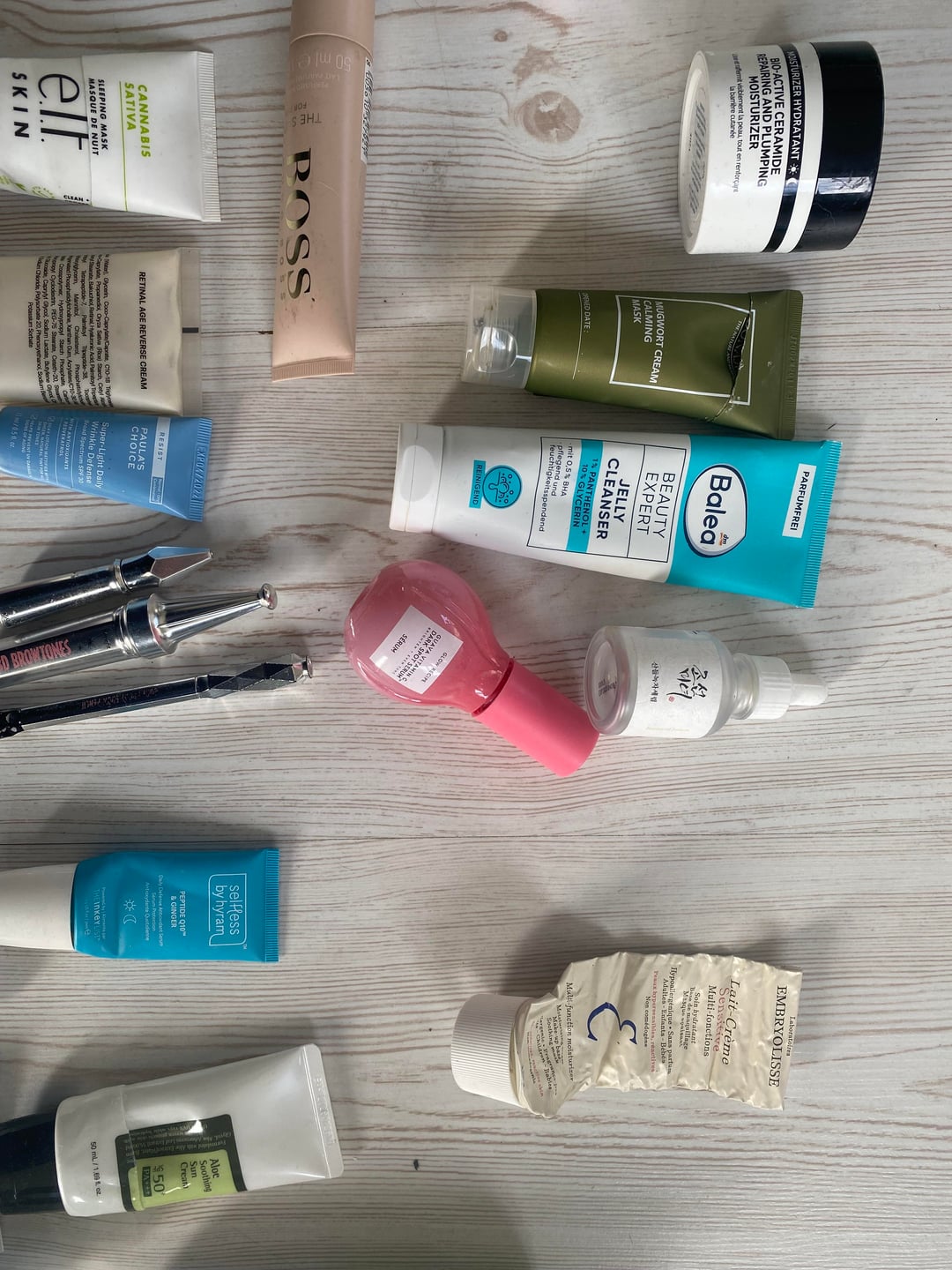 the two products from picture 6 went to the bin 🗑️ the lipgloss had a weird smell (from the beginning, why i never used it) and the “highlighter” palette from sleek 🤠 what should i say, those colours were not working for me as a highlighter, i hated using it, the formula was chalky and the shine/ glitter/ whatever not even really visible. i tried using as eyeshadow but eh. wasn’t nice either so i wasn’t keen on hate panning for 5yrs