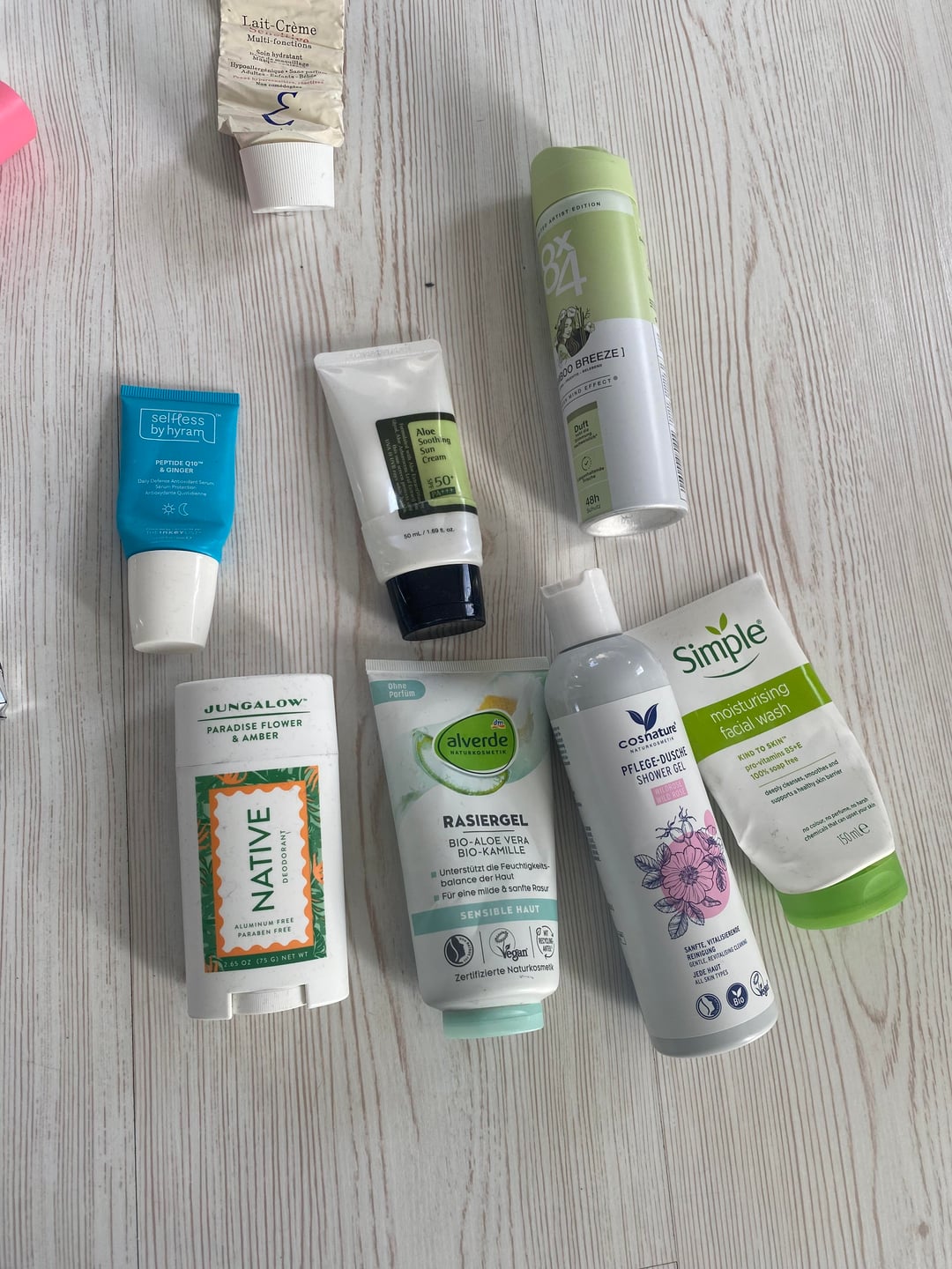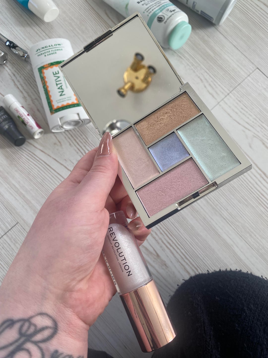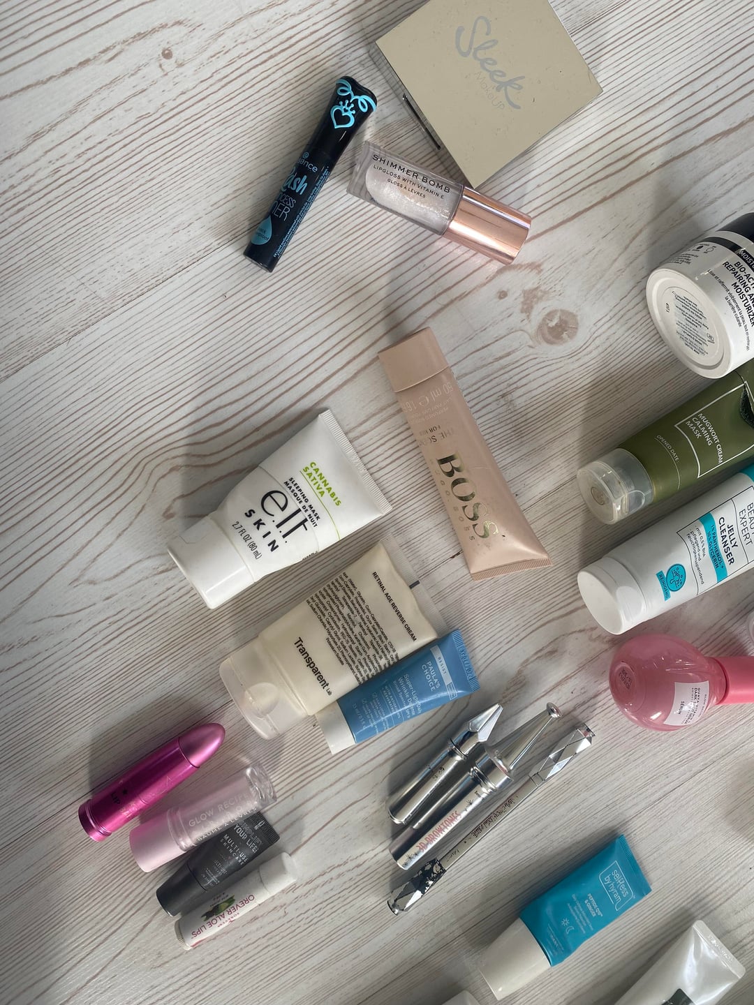 the two products from picture 6 went to the bin 🗑️ the lipgloss had a weird smell (from the beginning, why i never used it) and the “highlighter” palette from sleek 🤠 what should i say, those colours were not working for me as a highlighter, i hated using it, the formula was chalky and the shine/ glitter/ whatever not even really visible. i tried using as eyeshadow but eh. wasn’t nice either so i wasn’t keen on hate panning for 5yrs