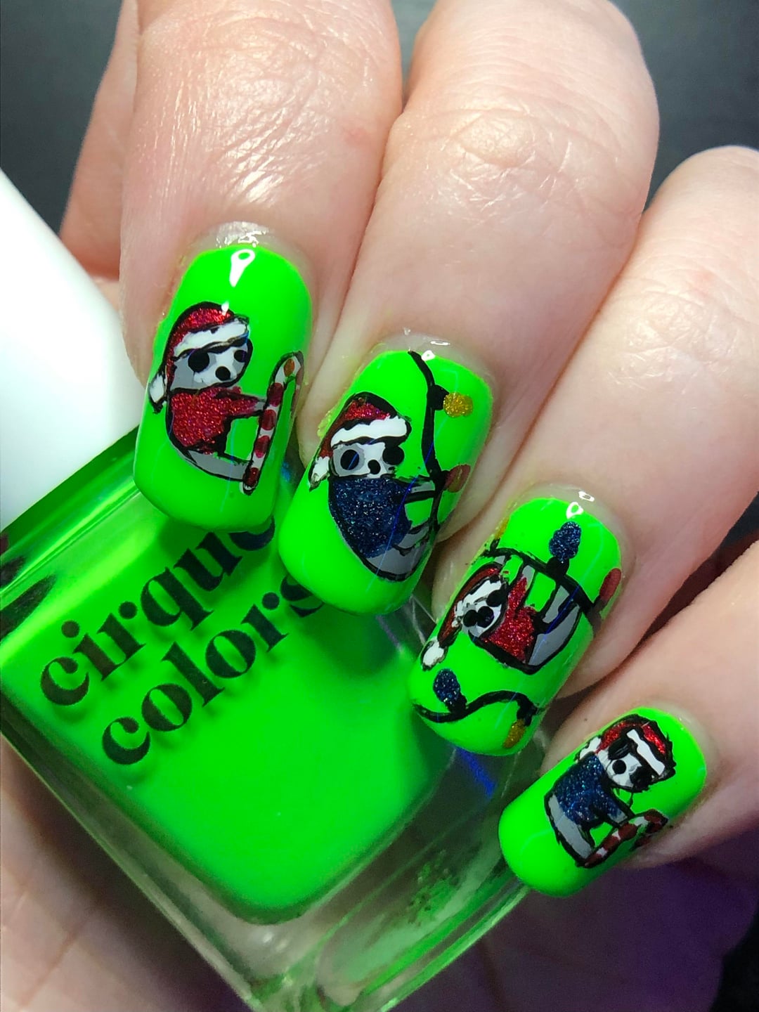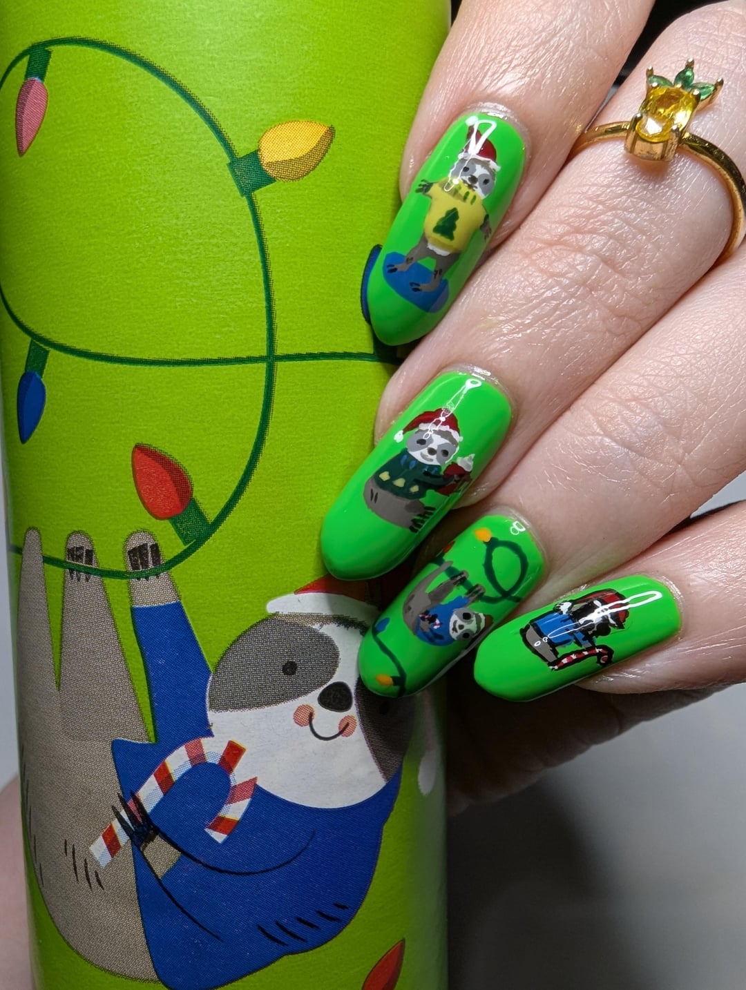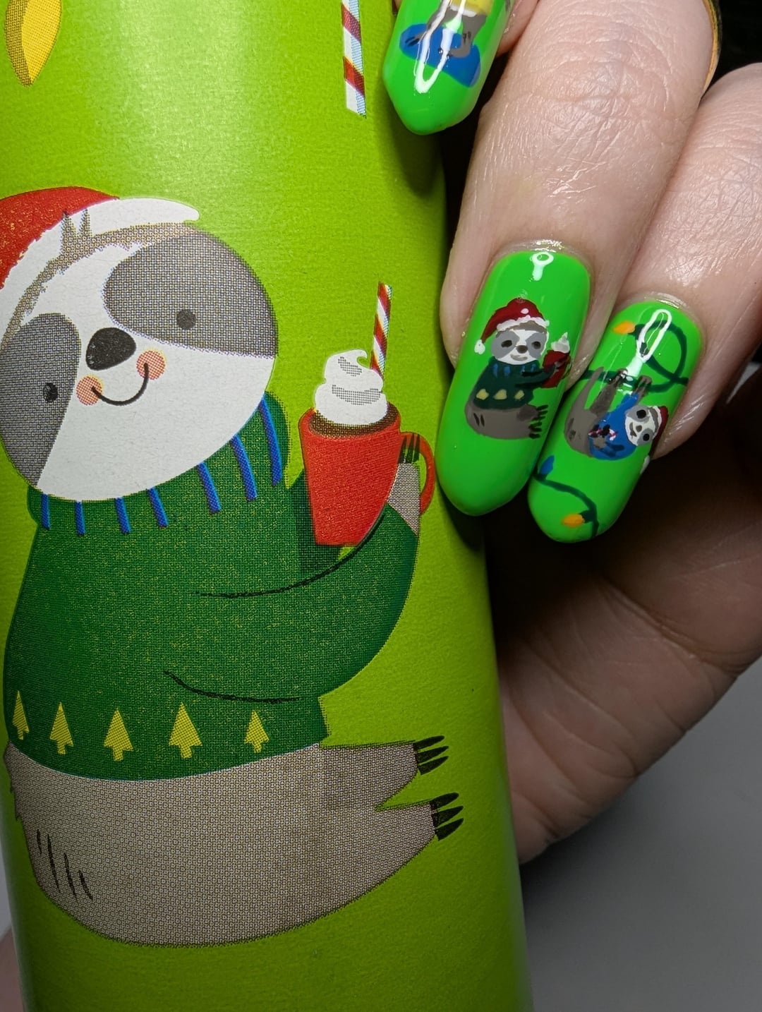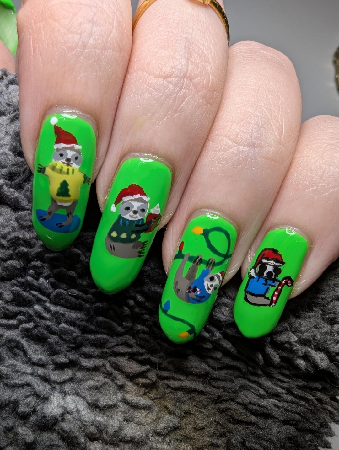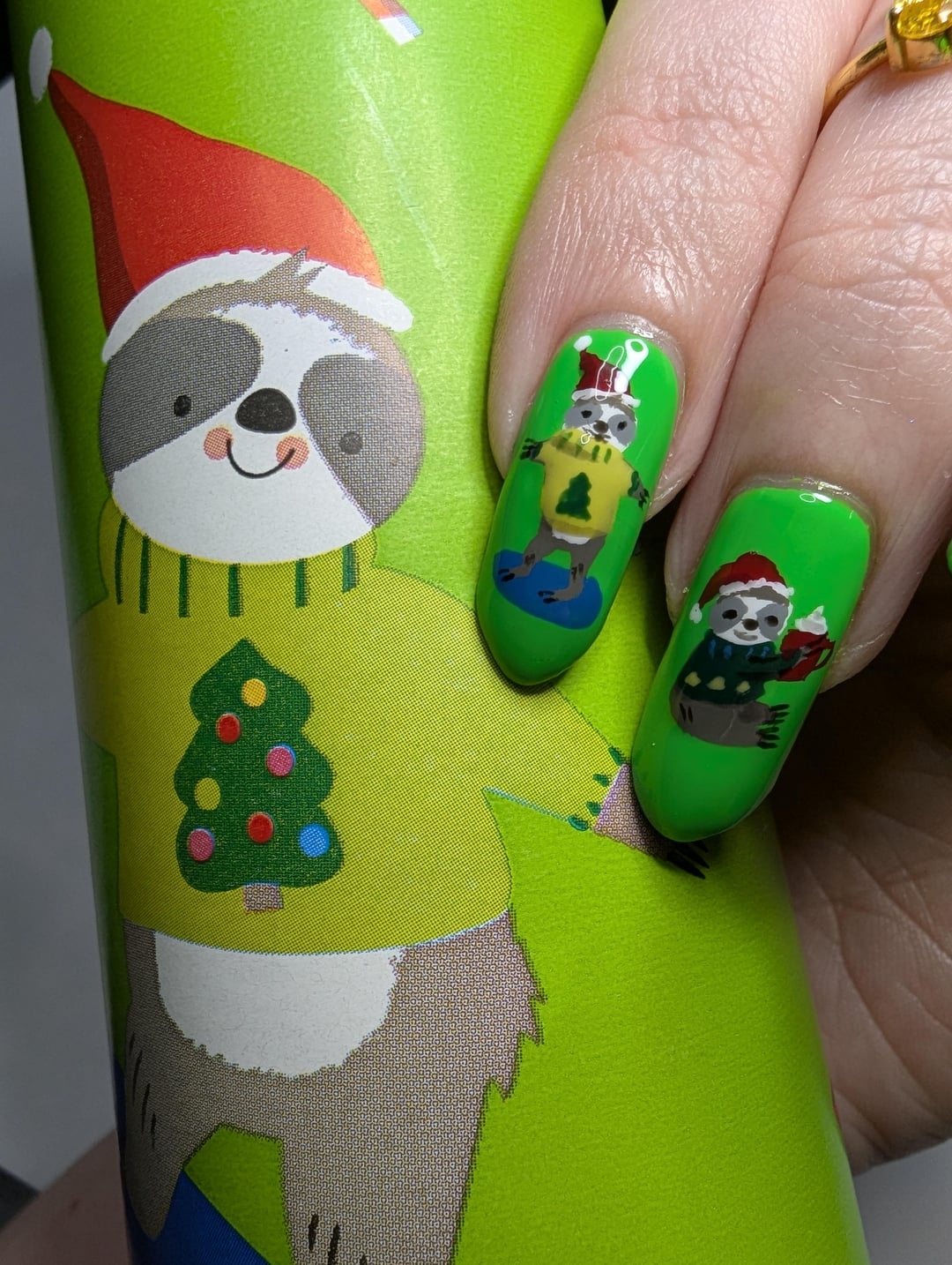 December 23rd 2022 I posted xmas sloths inspired by wrapping paper. while they have their charm and are stupid cute, I think I’ve improved massively sense then. Of course I had to pay homage to the lil guy I smudged on my pinky <3