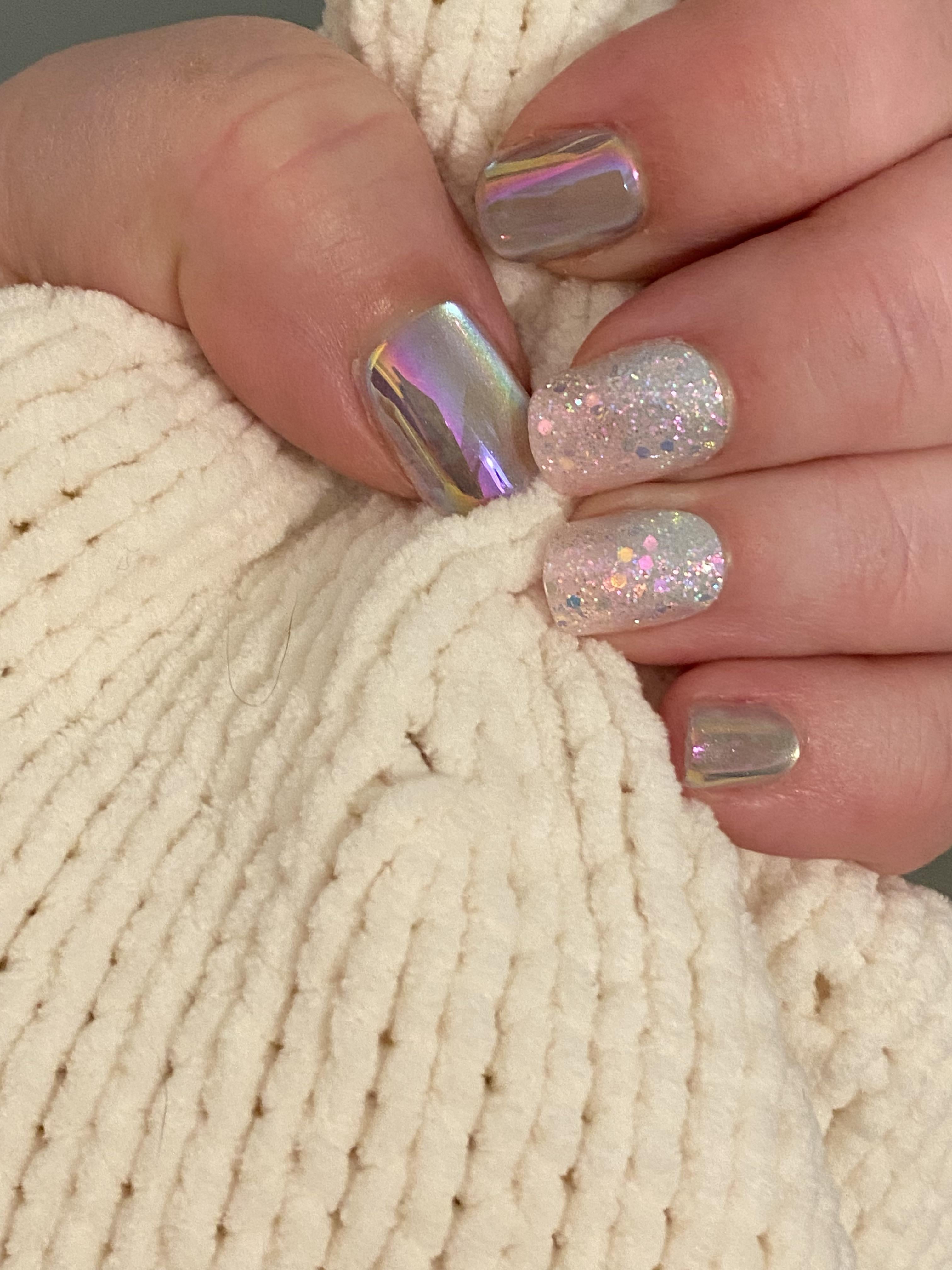 I love a short squoval press on, and they are darn hard to fine. Found an open box of Nail Reformation short iridescent that I was SO in love with, but the package of nails inside was missing. Also found a box of Kiss that were mostly appliqué style but had a few glitter nails, box was also open.