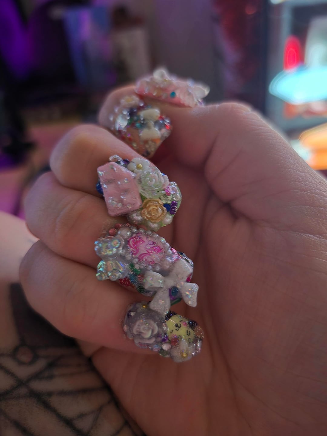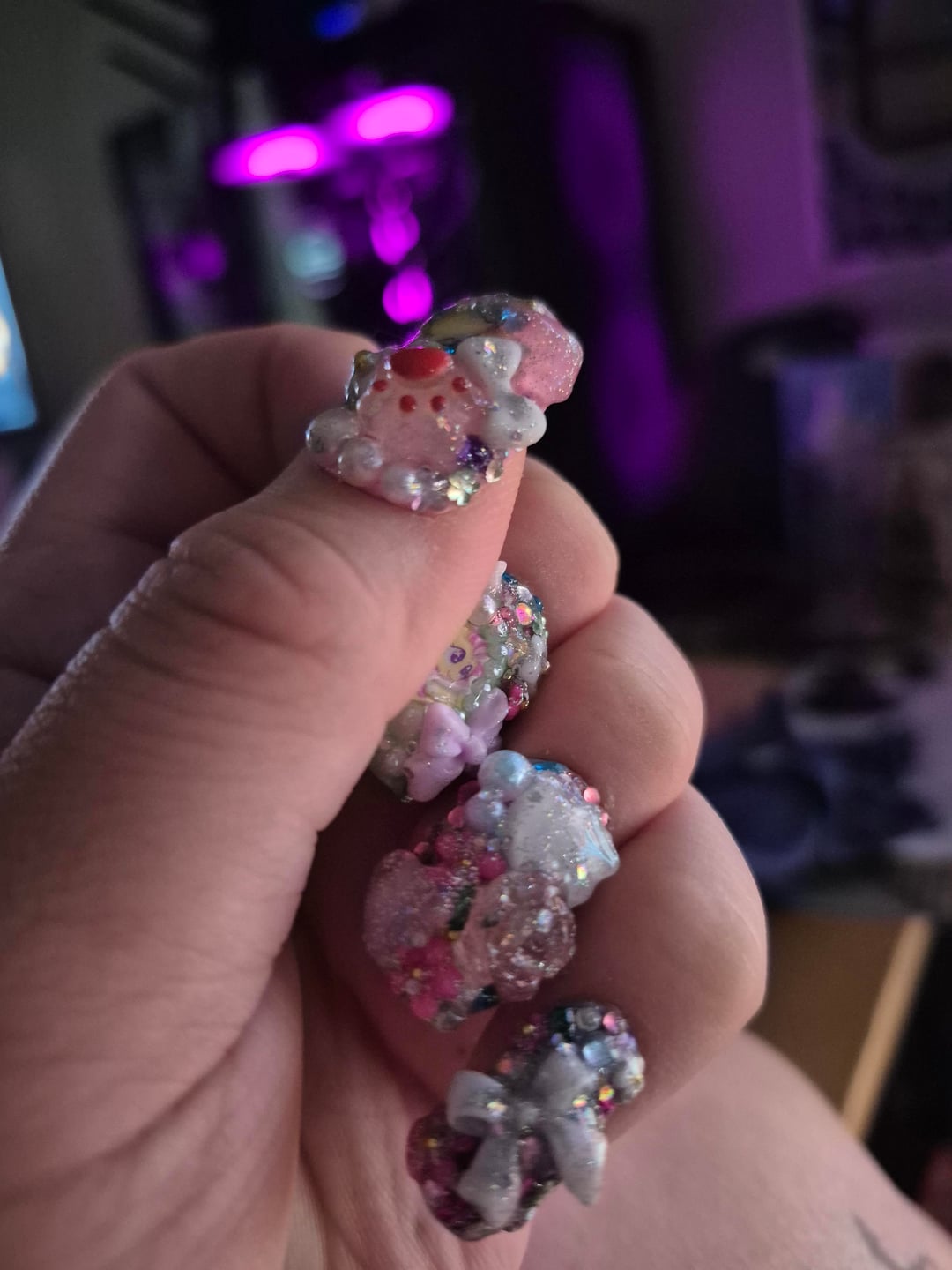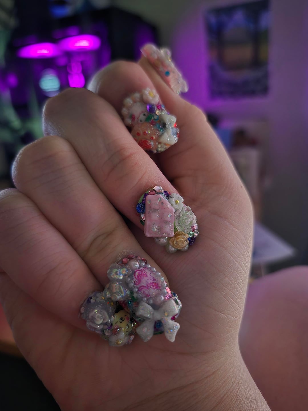 I've been obsessed with junk nails, and I got a bunch of charms for Christmas. These took so long to do I covered every inch of the nail making sure to use rhinestones of different sizes and shapes to fill in any gaps a used gel to attach all of the gems and charm.