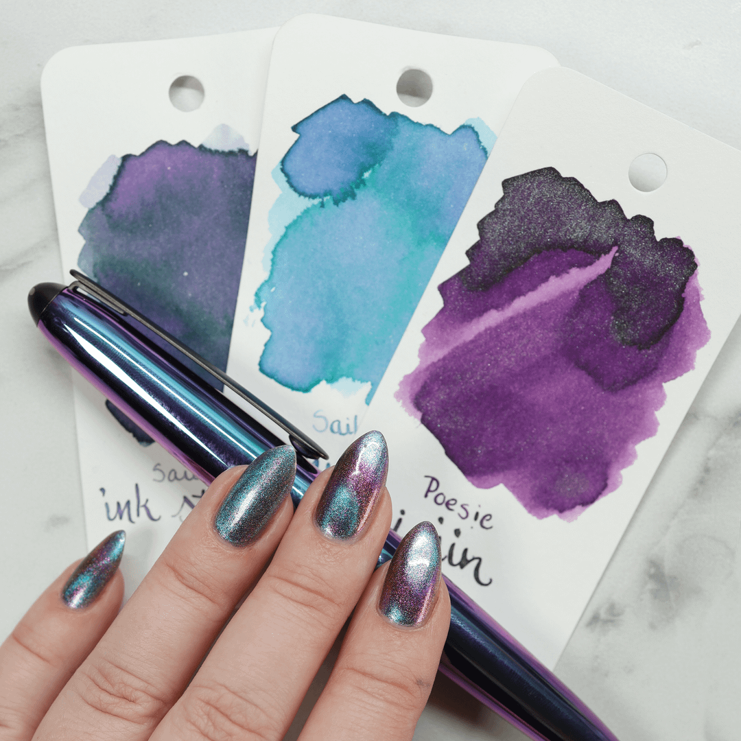 * Poesie Zi-Jin (auto-translated, so I canβt verify the name) – While this really hits the purple and green notes that I wanted to match with the Aero, I just couldn't bring myself to put a shimmer into a new untested pen, so I ended up nixing this one right off the bat.