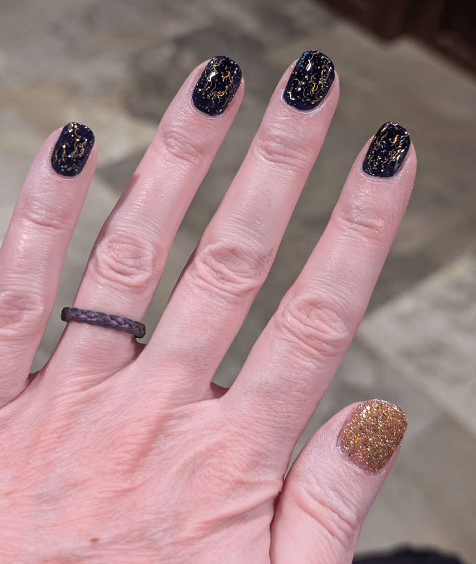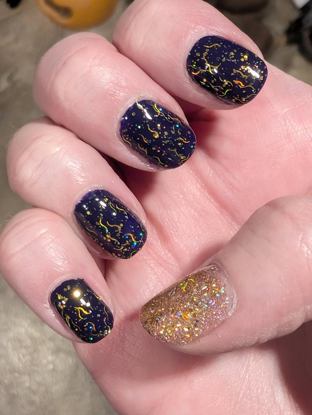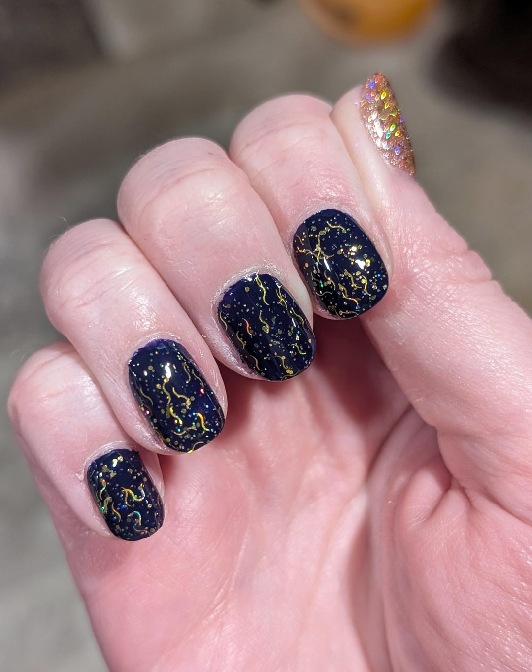 Rest of fingers: KB Shimmer Stay Put basecoat, 1x Holo Taco Indigo Away, 1x Emily de Molly Waiting for the Sun, 1x Cuticula's Limitless QDTC