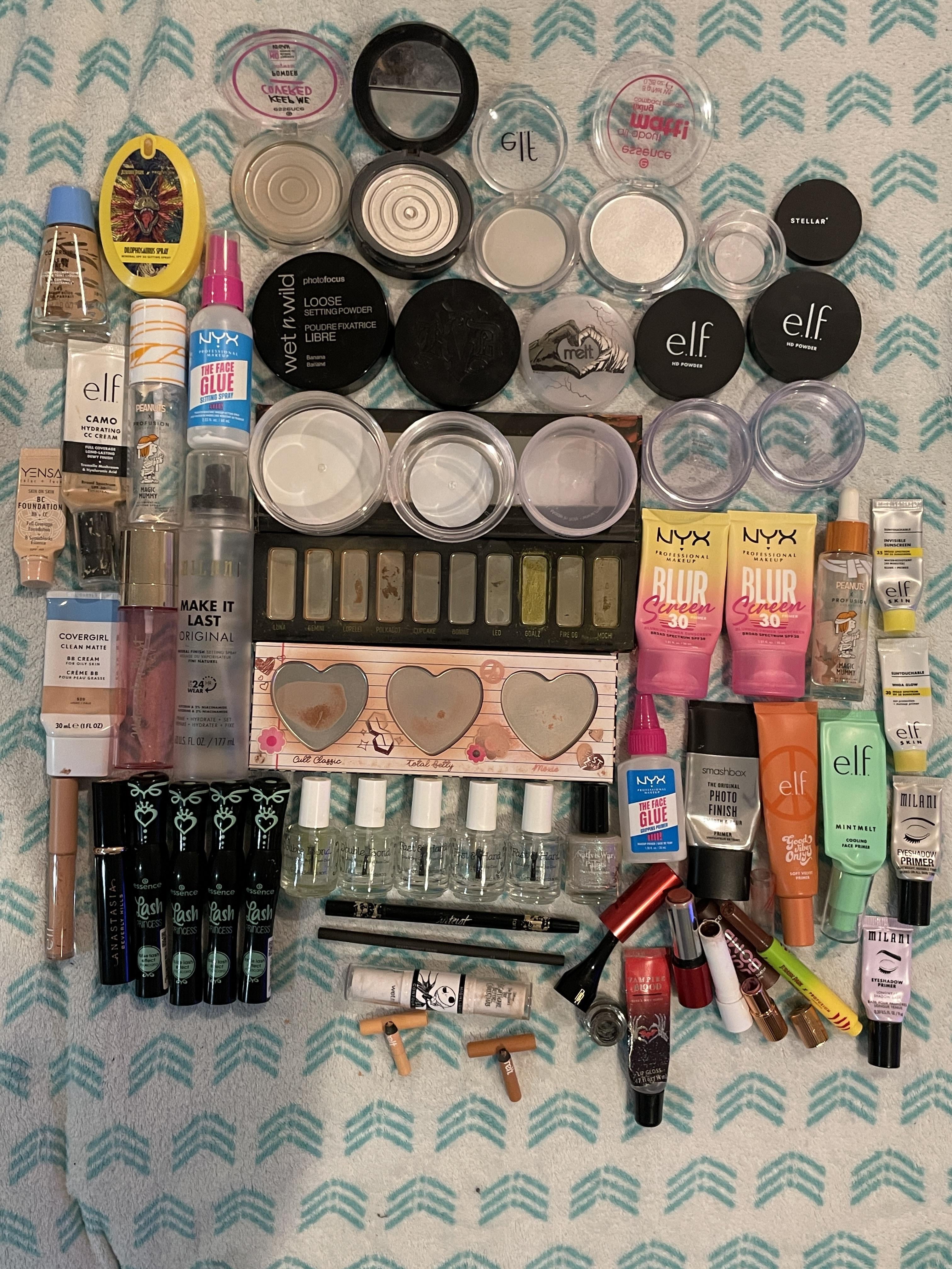 Here is a breakdown of the products: 10 powders (4 pressed, 6 loose), 5 mascaras, 2 eyeshadow primers, 9 face primers (2 mini), 3 eyeliners (one double sided w/liquid), 2 brow products (one pomade and one pencil), 5 lip products (one mini and one gloss), 5 setting sprays, 4 foundations (one mini), 6 nail polishes (one color, two base coats and three top coats), 1 concealer, 1 duo sided bronzer/ highlighter, 1 face palette (only the highlighter was left at the beginning of the year), and what I am more proud of, 1 empty eyeshadow palette that was over 4 years of progress. 🪩