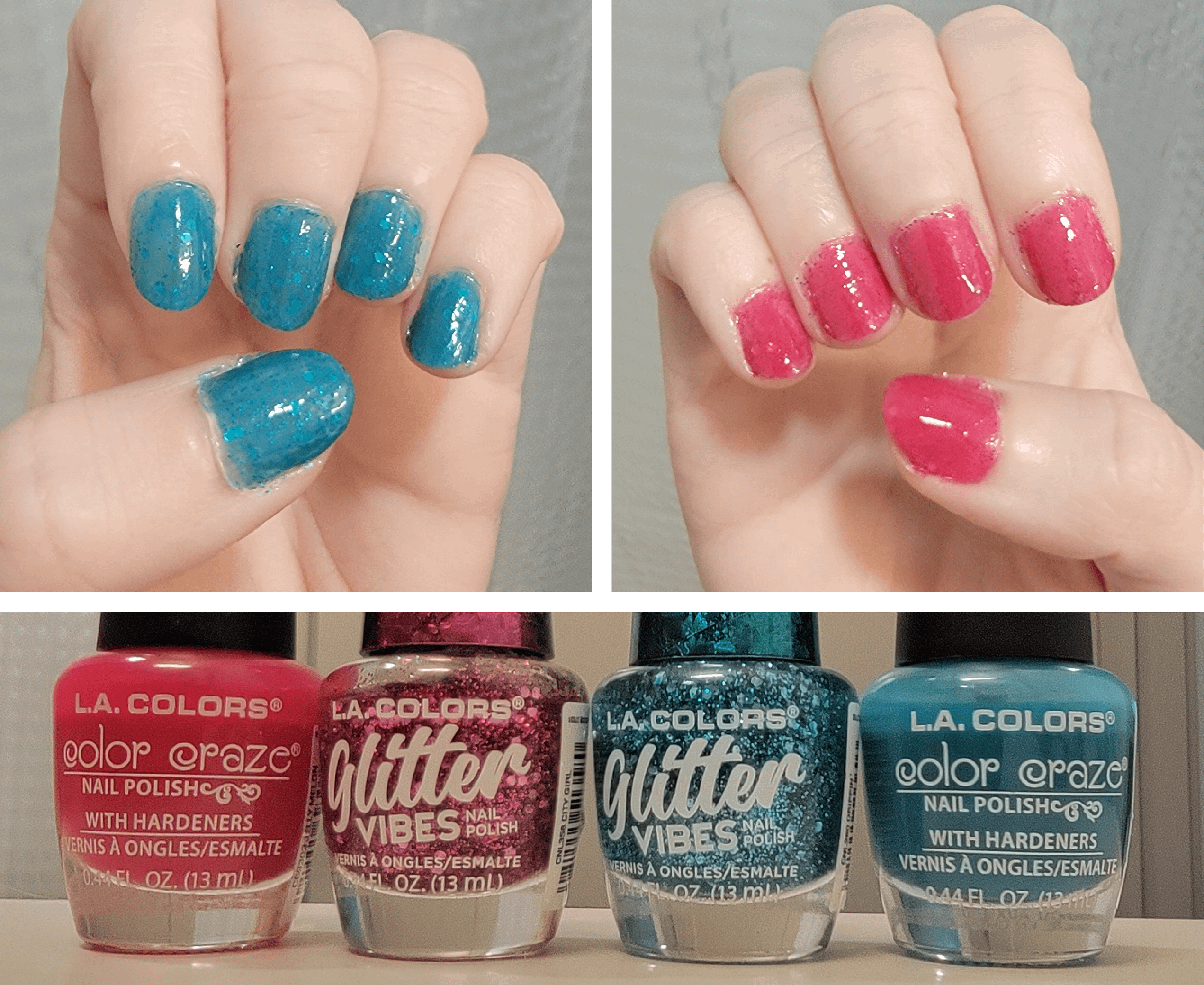 I definitely like the left hand better because you can see the teal glitter more clearly. I found the glitter polishes at Daiso and the jellies at Dollar Tree.