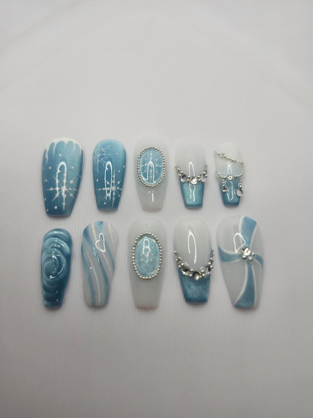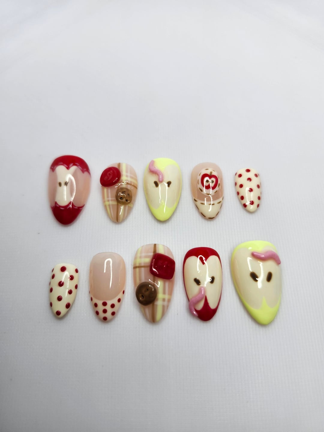 I stopped painting press-ons for a while but I was recently inspired by this new cateye gel polish I got from NotPolish. This blue is so dreamy💭❄️ The 2nd set is inspired by the apple nails that was trending last fall🍎🪱 by NicoletteNailz