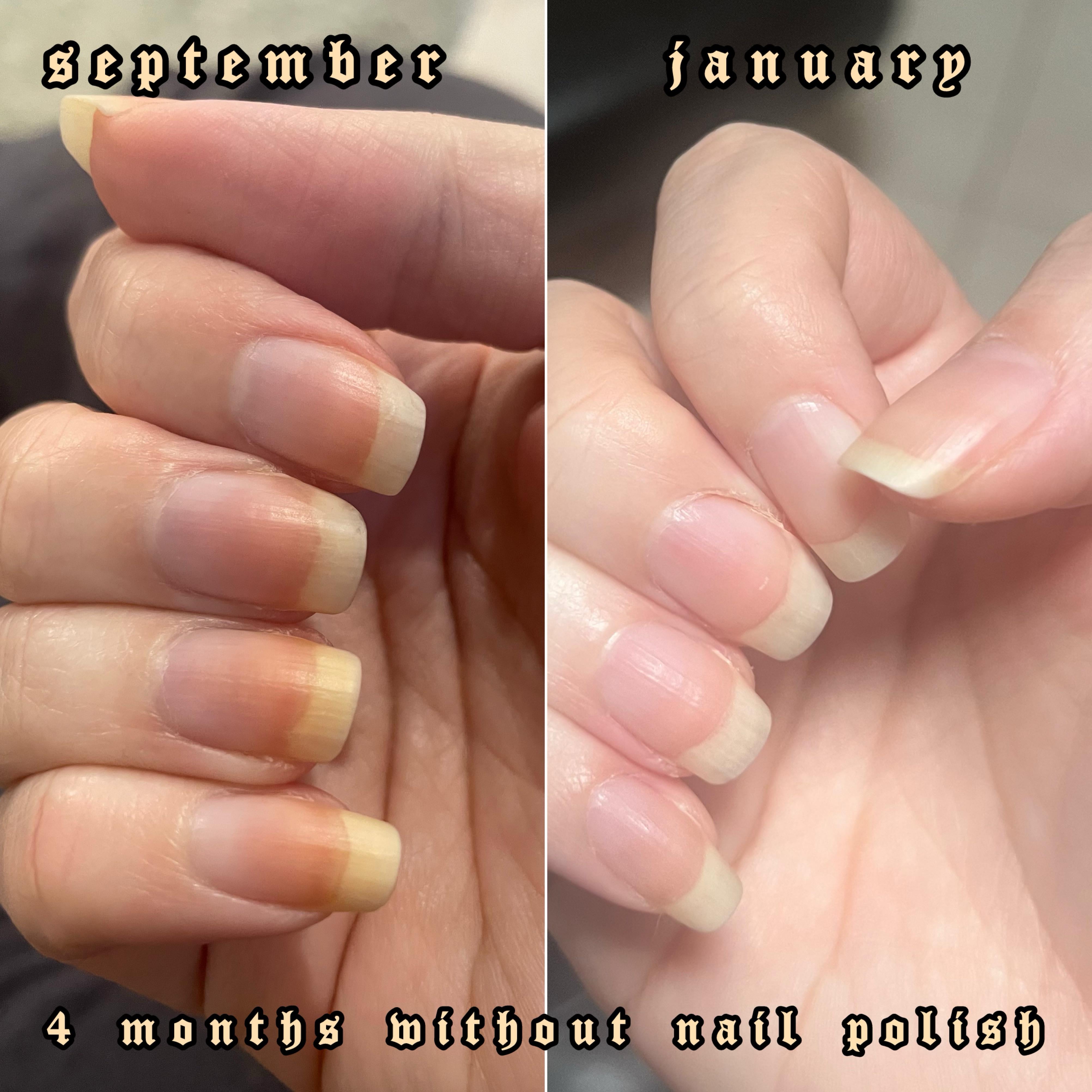 I wear various nail polish colours, mostly reds, blacks, purples and greens. All different brands for the colours. I always use Sally Hansen base coats. My nails are always painted, no breaks. They became so permanently orange/yellow because of this. No health issues, I asked more than one doctor, they all confirmed it’s my nail polish. I tested this theory and went 4 months without painting my nails and am happy to see they have returned to normal.