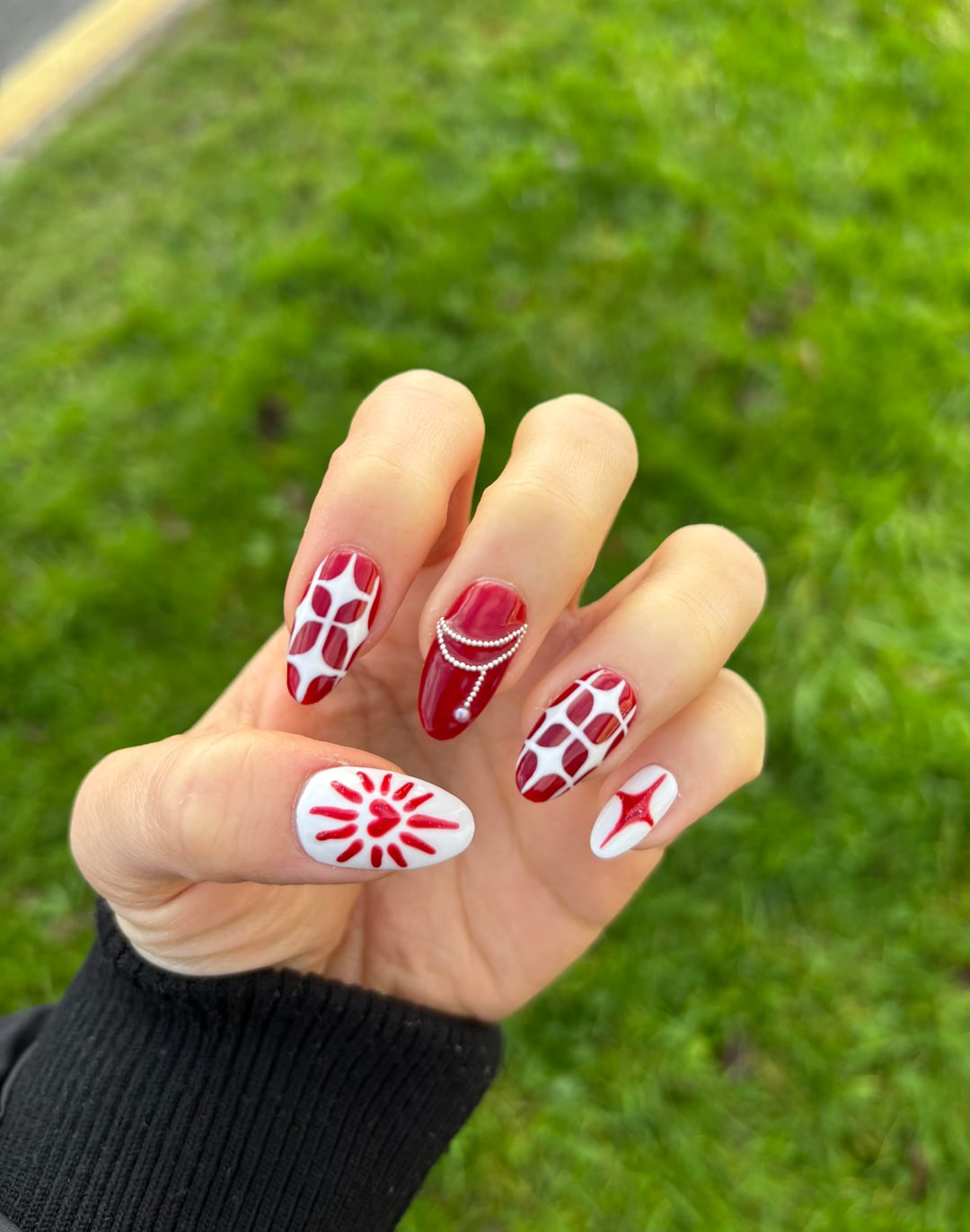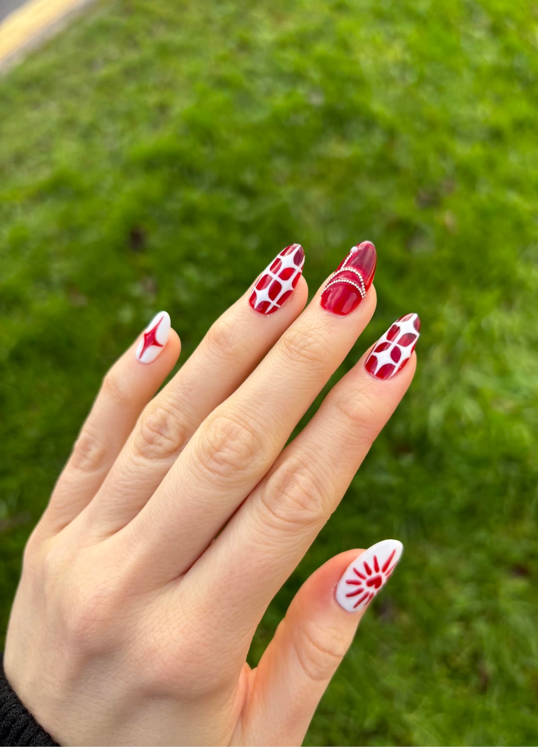Every year I like to do a set of holiday nails on myself, but personally I don’t like super festive nails. So, I always create something that uses some festive colours 🙂 I really enjoyed creating the red and white pattern on the index and ring fingers! It came out really nice imo. Honestly though, not the biggest fan of how the thumb came out. I was in a bit of a rush doing these so it makes sense 🙂 What do you think of this set?