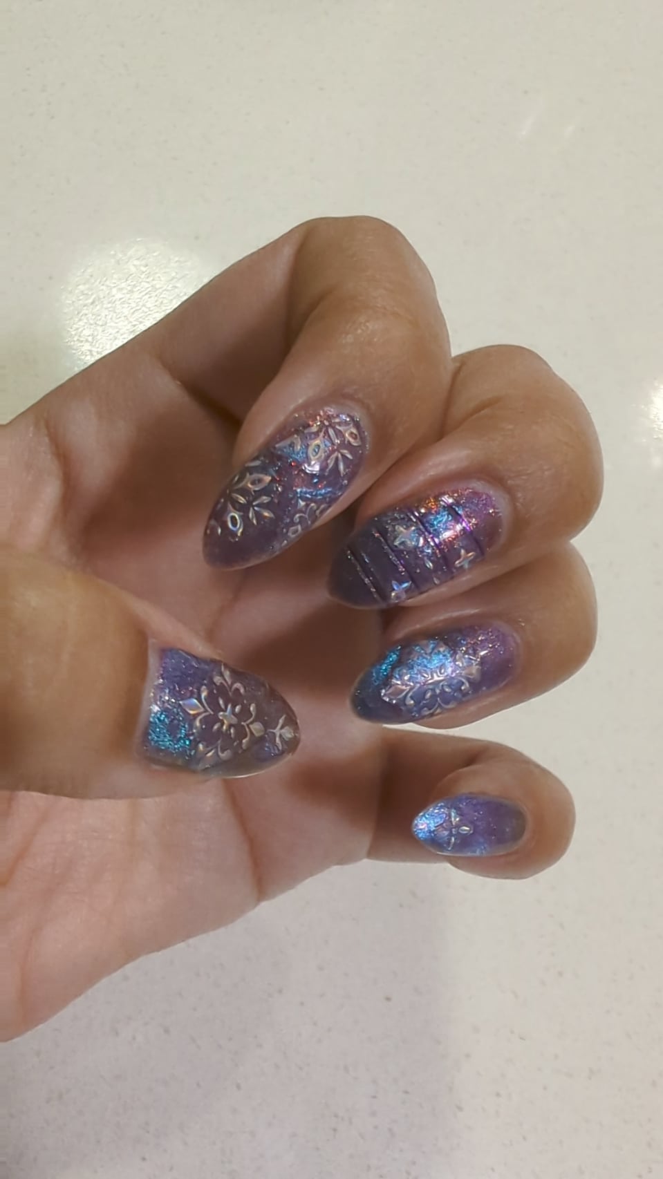And boy is this aptly named! Love the coppery pink and purple and blue! Base: nailtiques 2. Polish: sassy sauce twisted shifted velvetized. Holo nail stickers. Top coat: Starrily volumizing top coat.