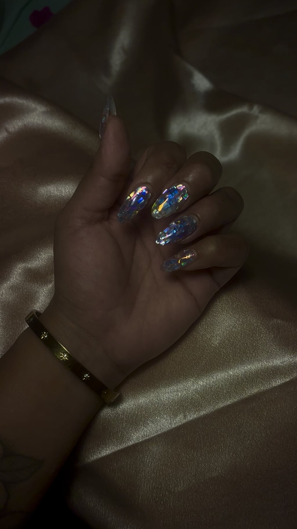•mgart universal base coat •magic gel paper forms w ibd hard gel (pink) to extend my free edge •chaun legend non wipe top coat •ug/y duckling halo chrome •mgart universal base, then added blancblanc frozen glitter + cured. •sofgel clear rubber base, thin layer •disco tiles, hand placed •mgart clear structure gel painted thinly on the centre of a dual form •hold the holographic orb thing on the centre, flash cure •fill mgart dual form with their clear gel (sized up x2 to be able to fit over the build below) to desired length •place on top of bedazzled nail to encapsulate – flash cure, full cure file + top coat