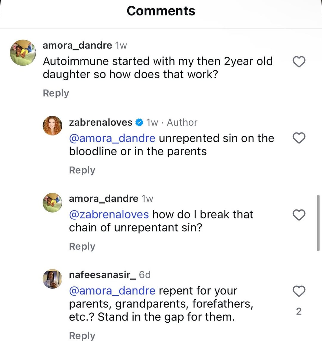 PART 2: Zabrena! I’m not trying to blow up your phone but I had to do another post! The further I dig, the more deluded she gets!! Her latest post blames autoimmune disease on unrighteous thoughts and not being in “communication with Christ.”