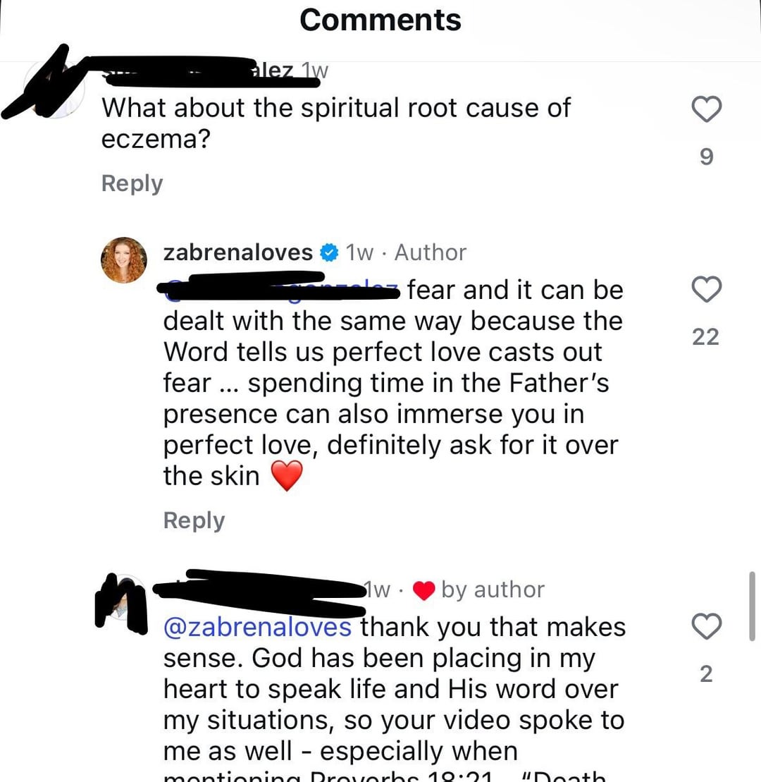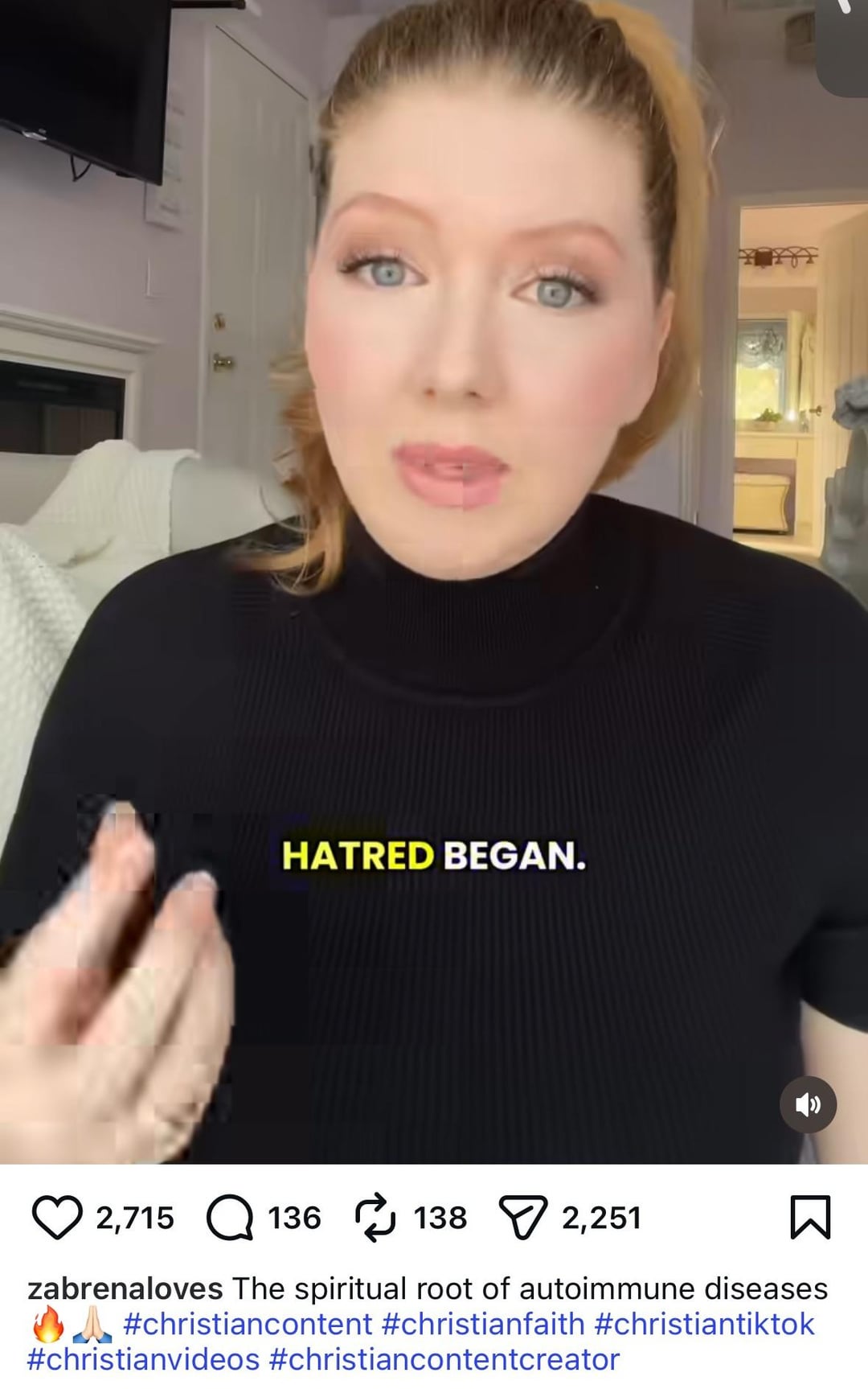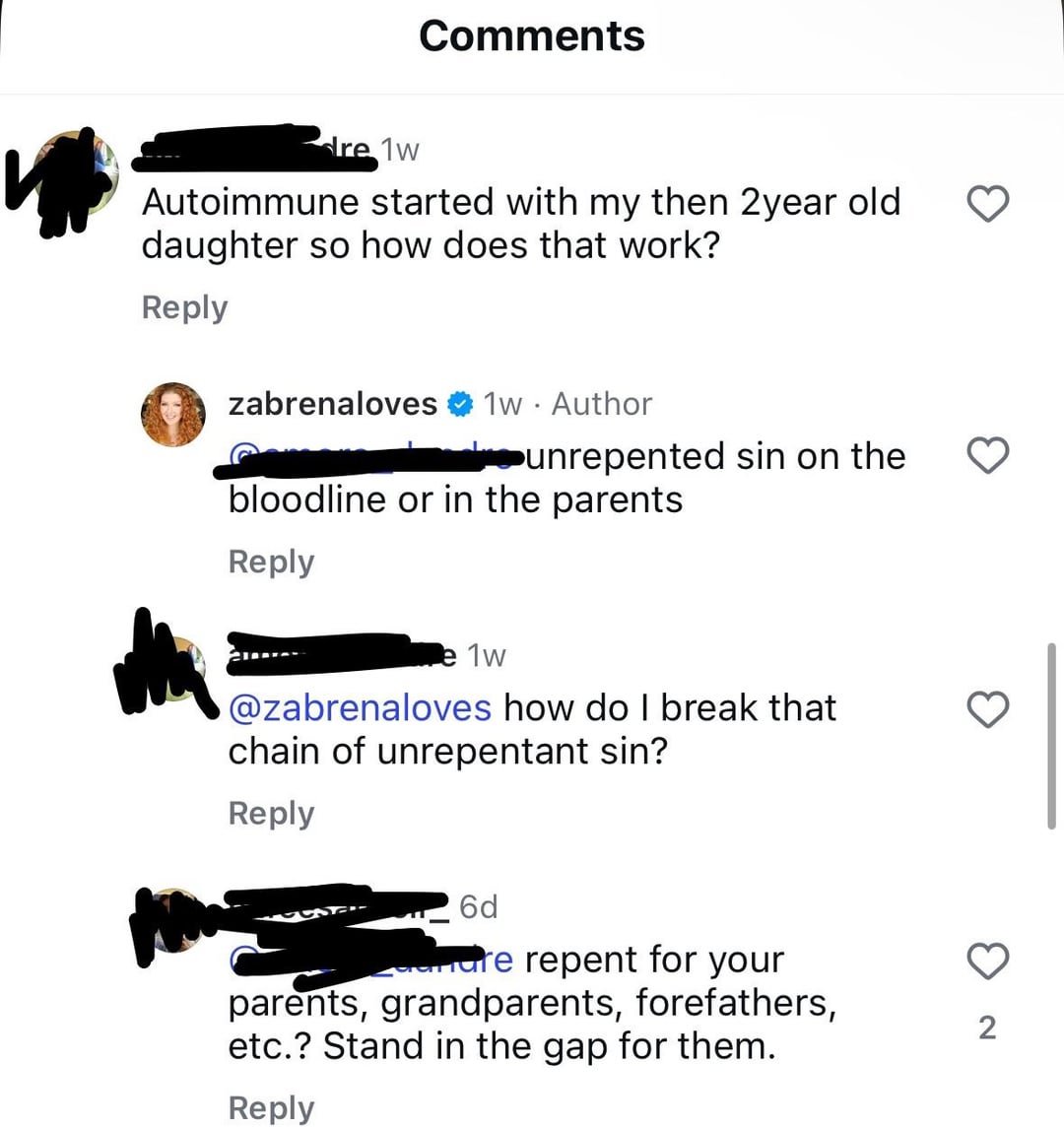 REPOST (names blurred) PART 2: Zabrena! I’m not trying to blow up your phone but I had to do another post! The further I dig, the more deluded she gets!! Her latest post blames autoimmune disease on unrighteous thoughts and not being in “communication with Christ.”