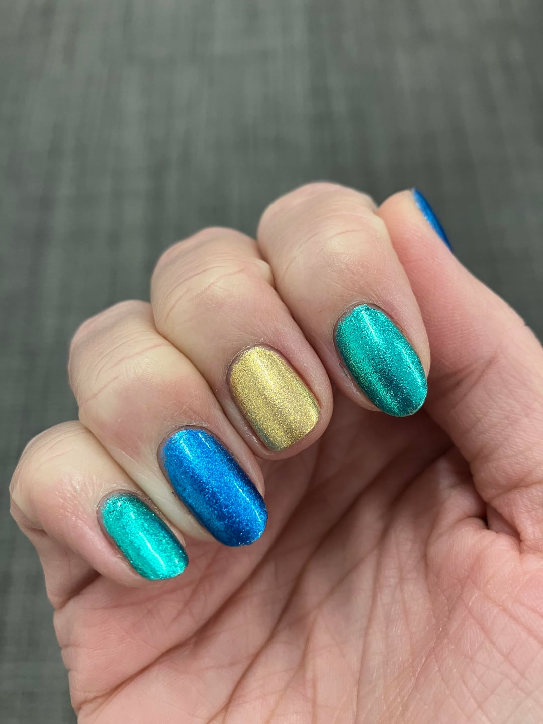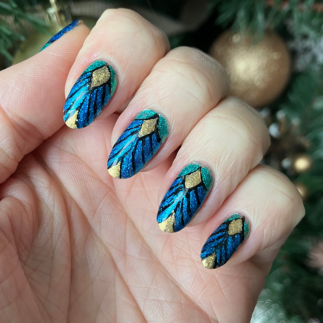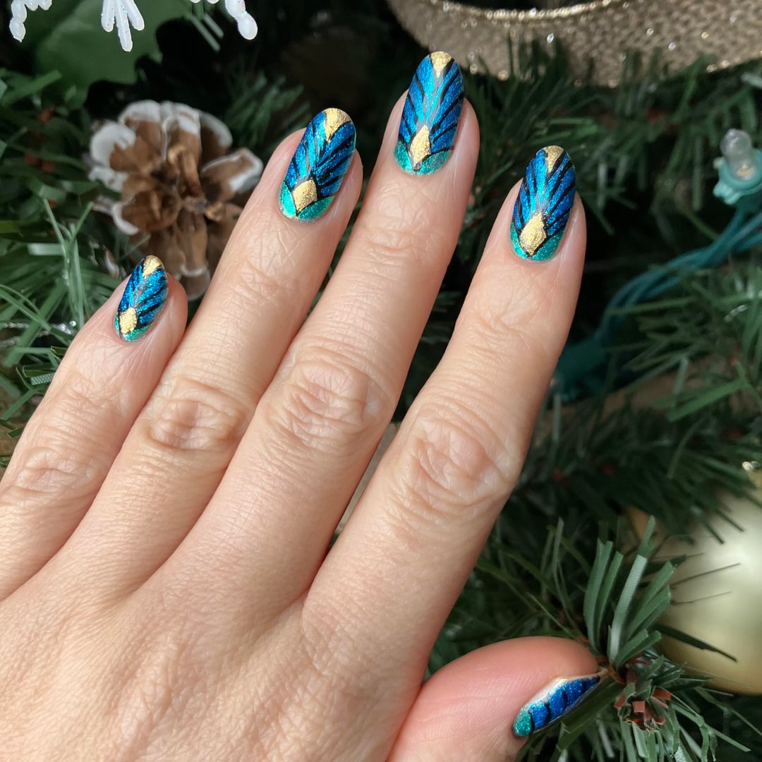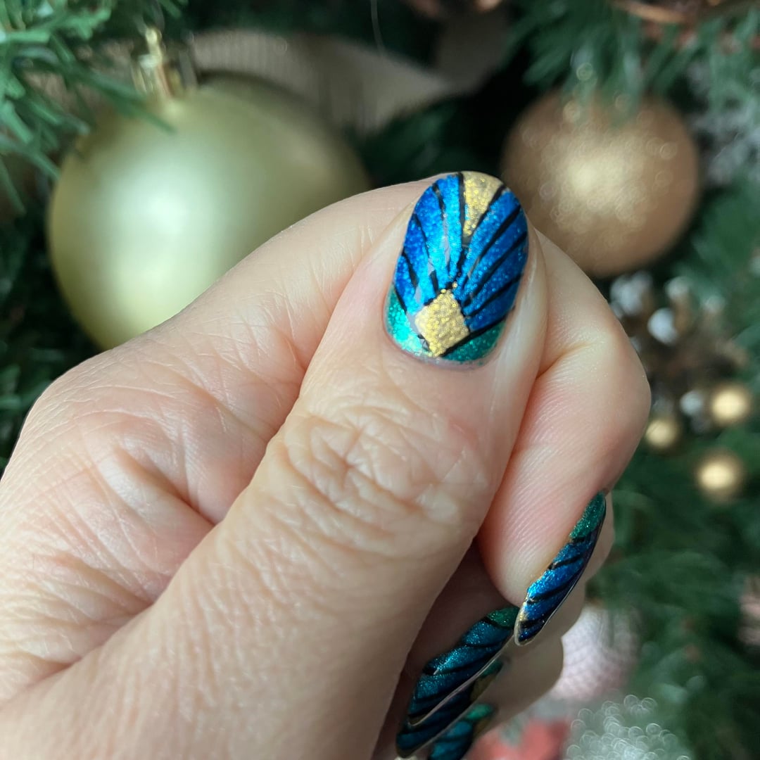 I actually think from far away this mani looks stellar. I love the color combo of the teal, blue and gold. However, every time I took pictures I noticed how much my black outline floated around. The best nail ended up being my thumb, which is frustrating difficult to get in pictures with my other nails. Maybe someday I'll have elegant hand poses.