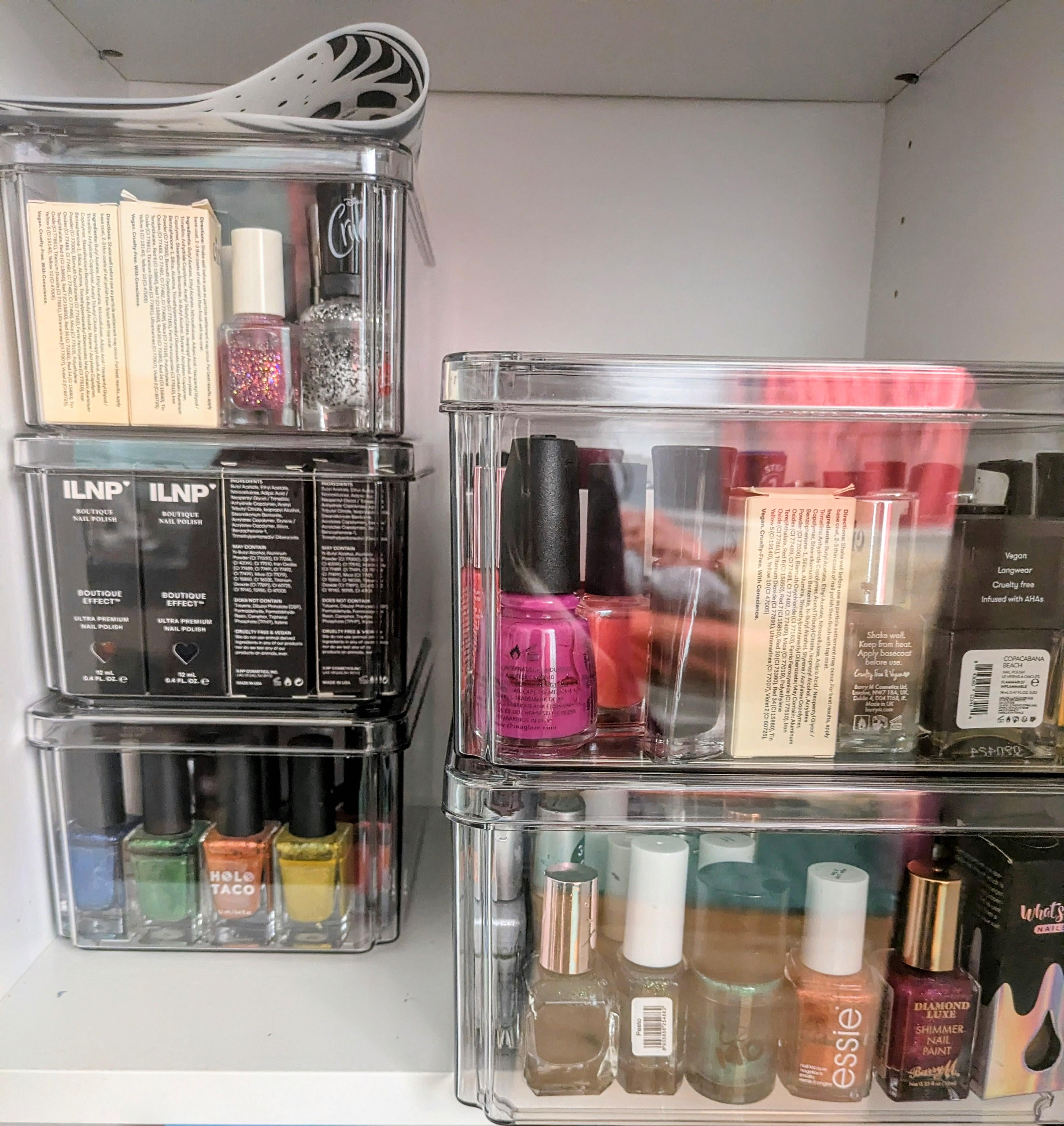 I don't really have the room for a Helmer or similar, but wanted to upgrade from the collection of horrible cardboard boxes that my polish was in. My dad found these stacking boxes on Temu – they're the perfect height to hold polishes without wasting too much space at the top (11cm depth). They do make my collection slightly less accessible as I have to move them around to get to whatever's in the bottom, but the increased visibility has already made me wear polishes I wouldn't otherwise have reached for. I guess time will tell how they hold up, but they do feel nice and sturdy so I'm optimistic! Thought I'd recommend them for anyone else with limited storage space.